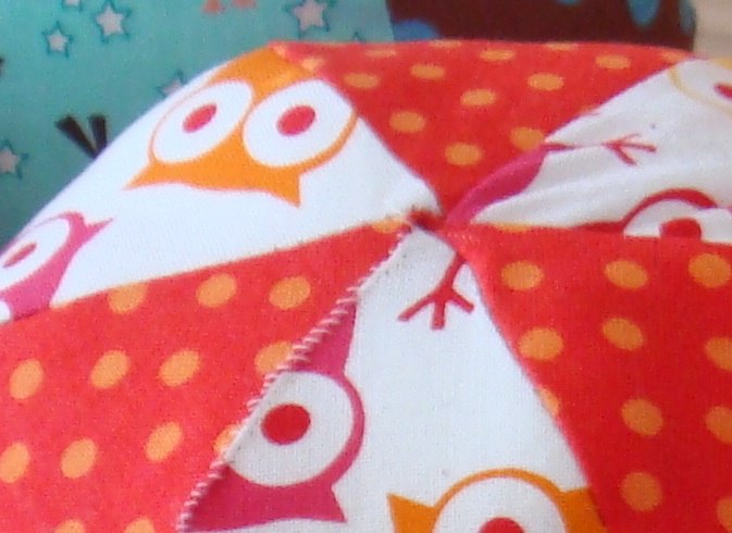 Men, det i gør, er at klippe 6 stykker, i det stof i nu ønsker. Derefter syes de sammen en af gangen - og med vrang siden mod hinanden. Når i når den sidste flap, syes den selvfølgelig kun i den ene side. Jeg har taget et billede er en af toppene på en af mine bolde - som i kan se er det sidste syet i hånden. Det jeg gjorde var at vende bolden rigtigt, da jeg kun manglede den sidste. Så syende jeg fra hver sin ende, cirka 4-5 cm ind så der bare var et lille hul på midten tilbage, som jeg kunne putte fyld og klokke igennem. Jeg lavede en så lang tråd, at jeg bare kunne sy videre der hvor jeg stoppede efter den var fyldt.