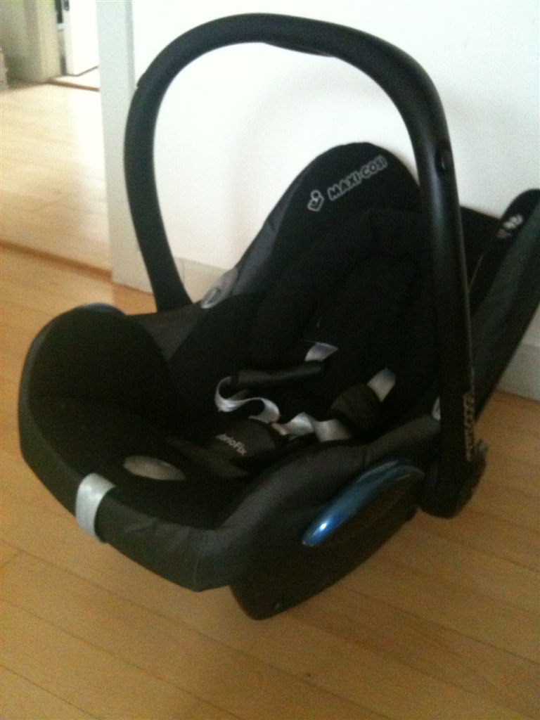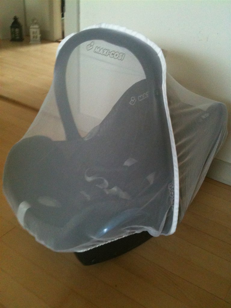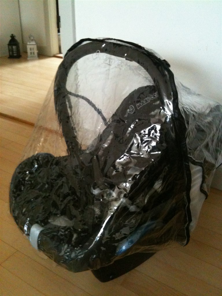 Har denne autostol, sælges med base, fluenet og regnslag.