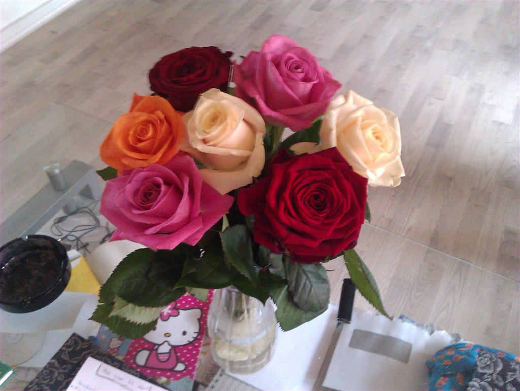 Min kæreste og jeg har været forlovet i et år i morgen også i formiddags tog han lige pludselig ned i byen uden at sige hvorfor. Han er så væk i et godt stykke tid og ringer til ham, men han tager den ikke. Bliver lidt små irriteret og sidder og bander for mig selv. Så kommer han ind af døren med den smukkeste buket roser til mig!