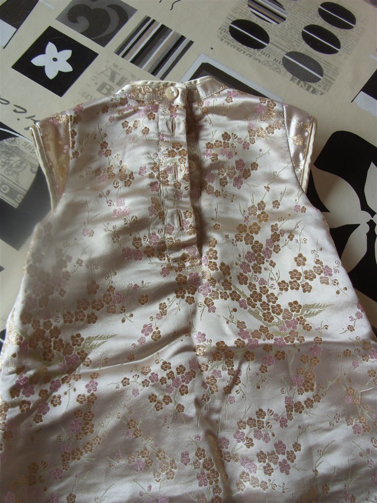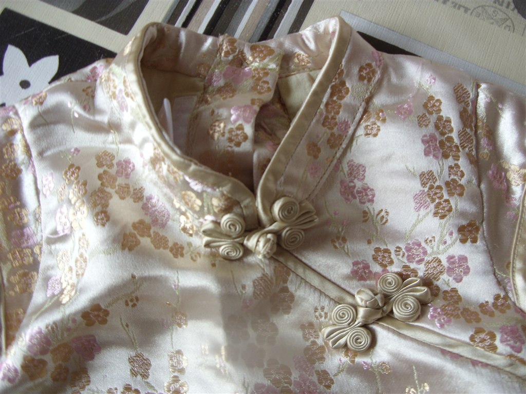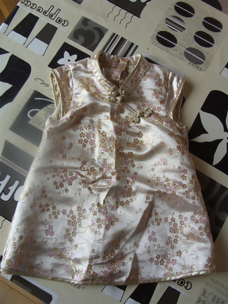 1. kjole: Str. 68. Guld, med små lyserøde- og guldblomster. Har Kina-agtigt snit. Knapper i ryggen Brugt en gang. Fra H&M. Meget fin.