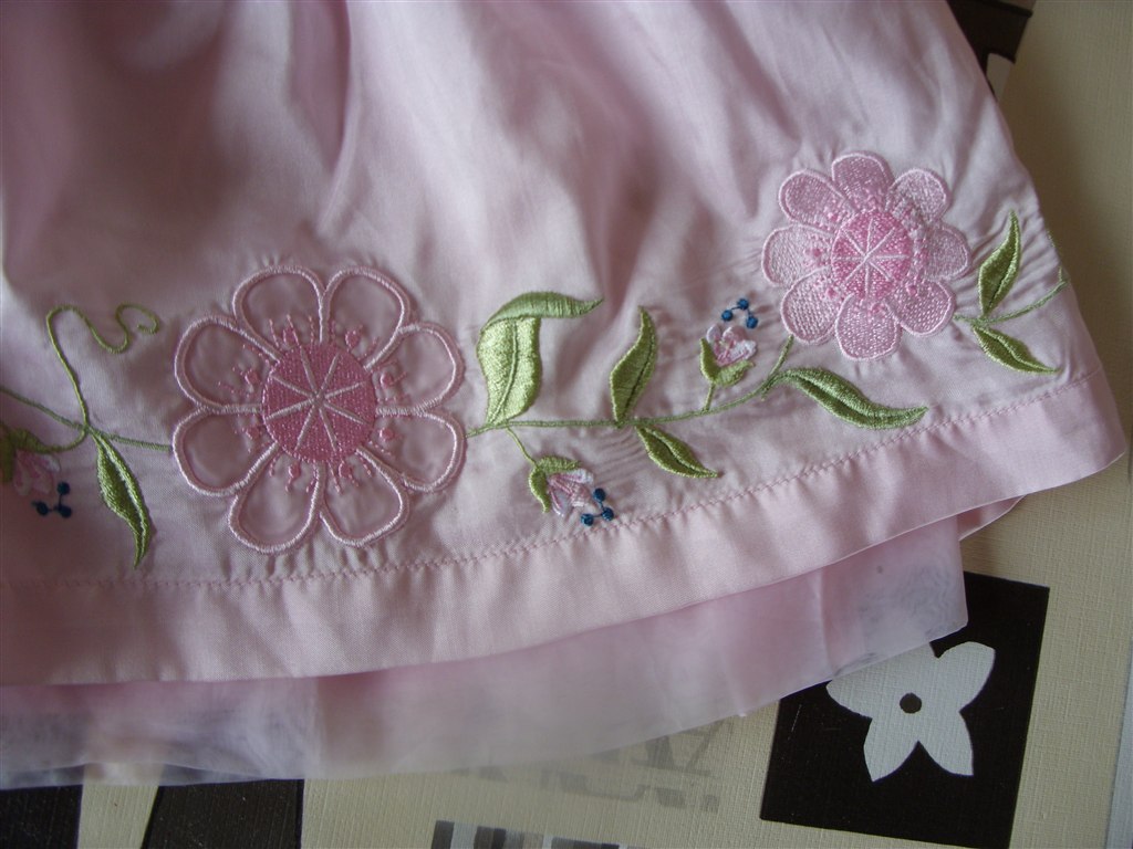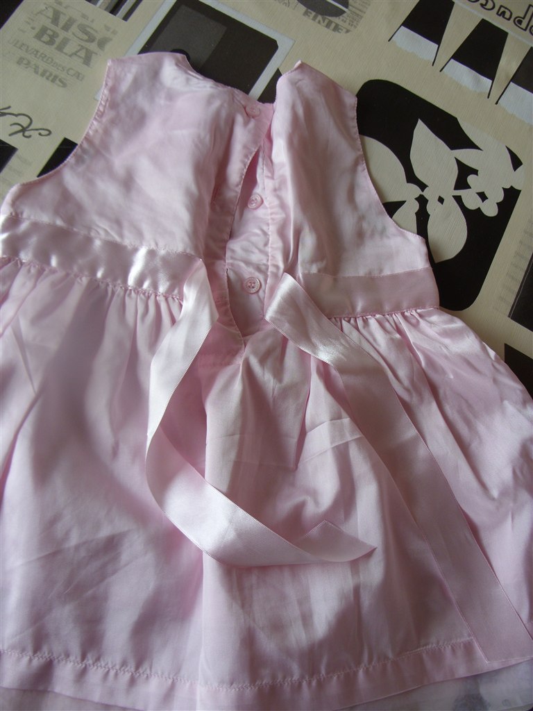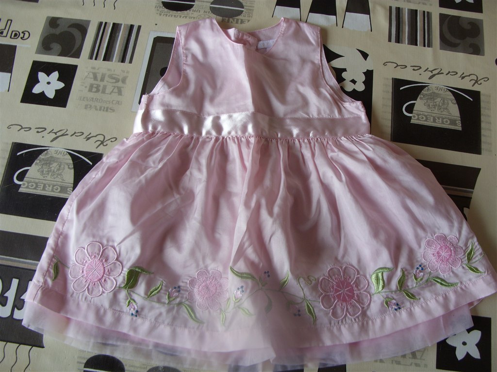 2. kjole: Str. 74. Lyserød med blomster forneden. Bindebånd der bindes på ryggen. Knapper i ryggen. Brugt en gang. Fra H&M. Rigtig sød kjole.