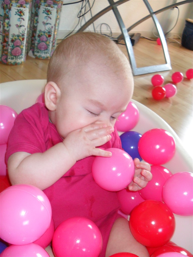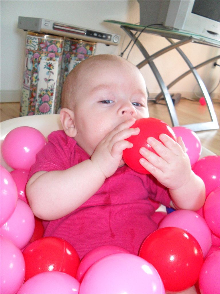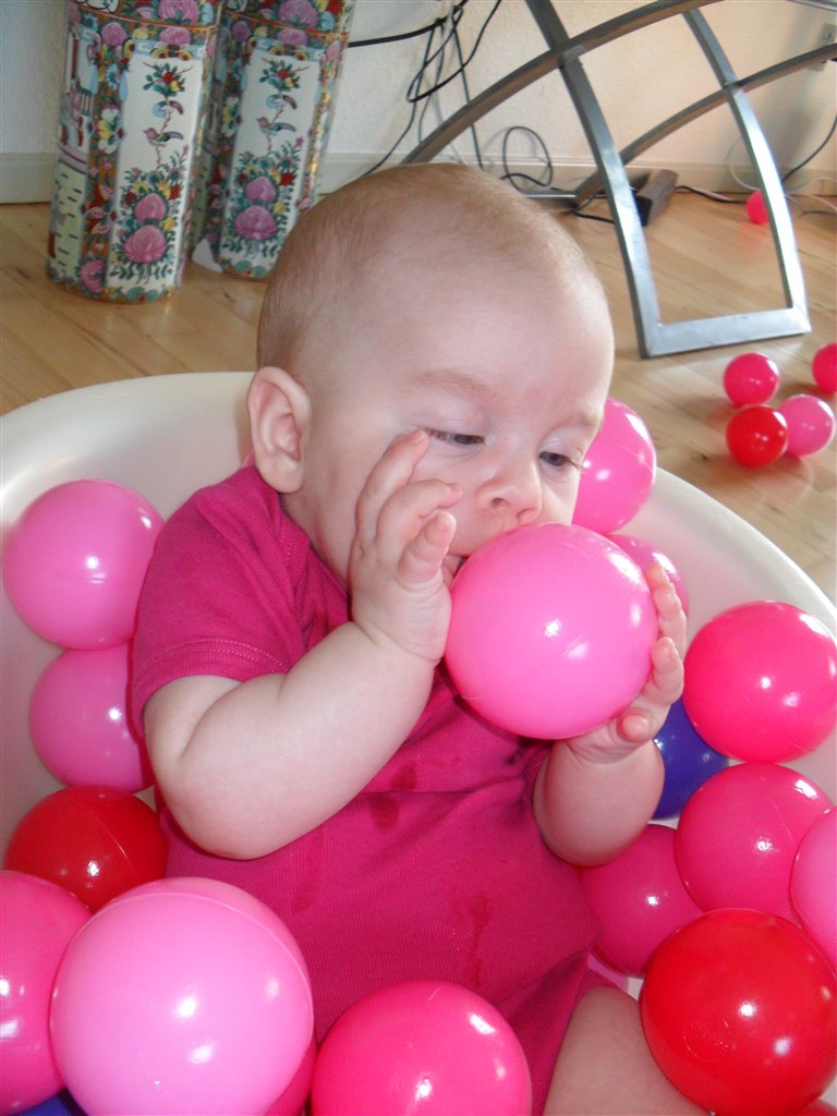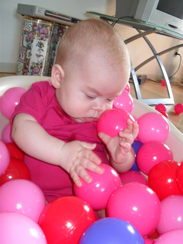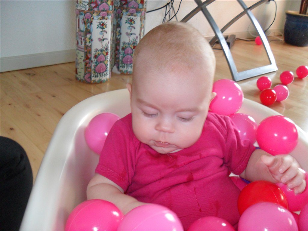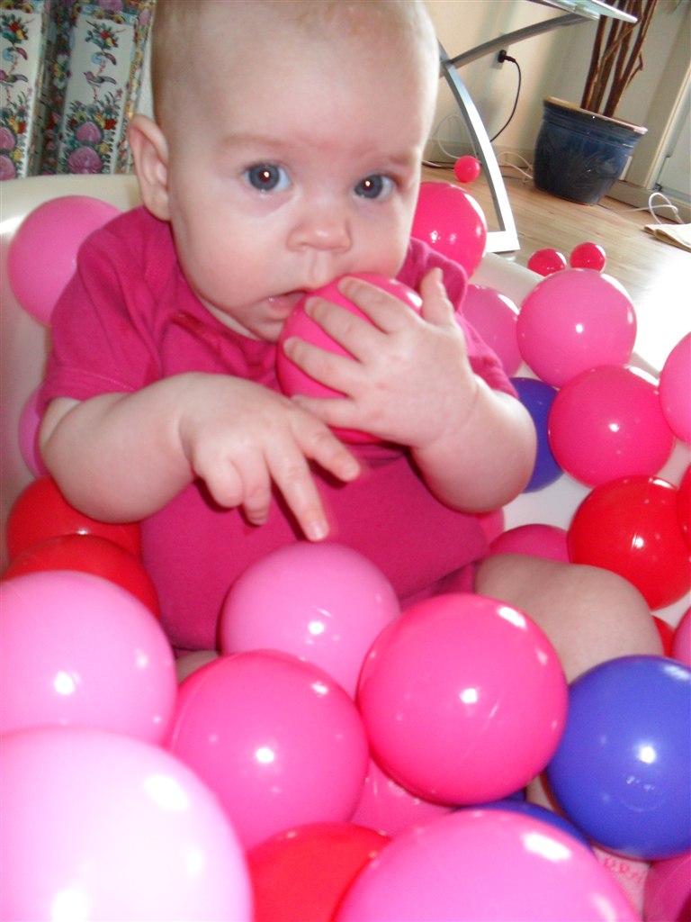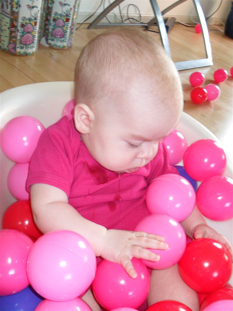 Læste i en bog at det skulle være godt at putte dem i et bold "bad", for det vil stimulere deres følesans.. Så det vil jeg da ha afprøvet.. Og det lod til at hun ku li det, så det bliver bestemt ikke sidste gang hun skal prøve det