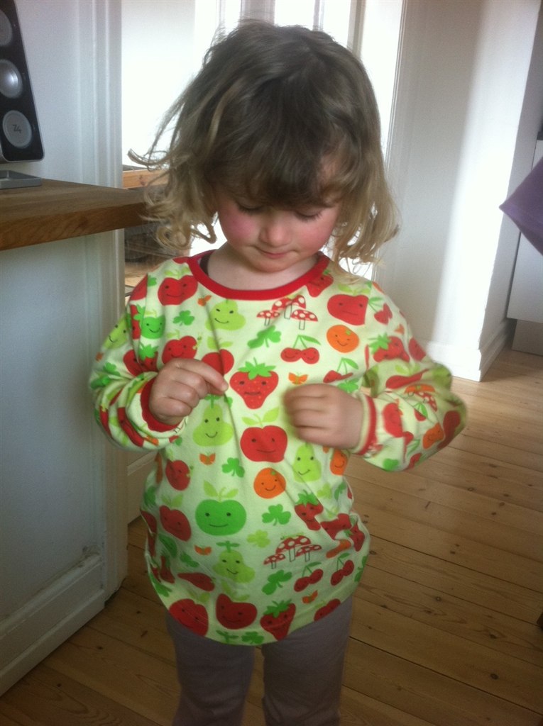 Den nye hættebluse skulle prøves med det samme... og så 2 min. efter var der spildt kakao ned af blusen
