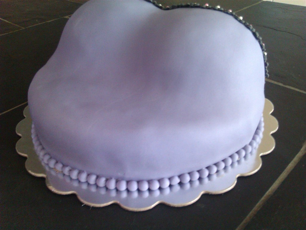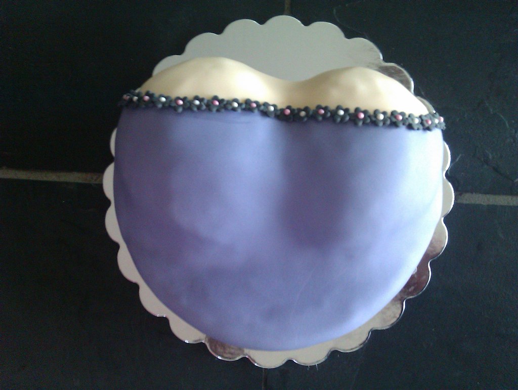 Lavet med lyse bunde med hindbærmousse og tobleronecreme, smurt op med chokoladesmørcreme og pyntet med lilla fondant og små sorte blomster.