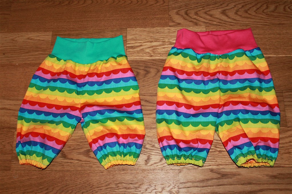 bukserne er overlocker sammen, har rib foroven og elestik i benene..