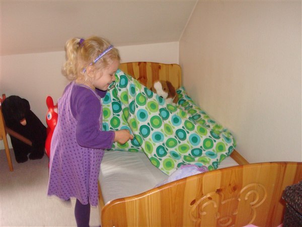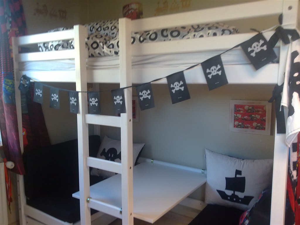 Lærke har en gammel Junoseng. Her til efteråret er det planen hun skal have en halvhøj seng, for at spare lidt plads på hendes værelse (og give hende muligheden for at lege hule indenunder)