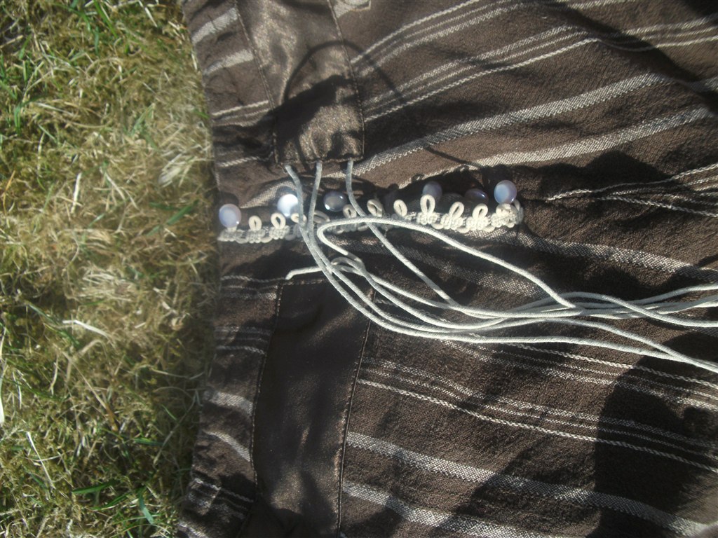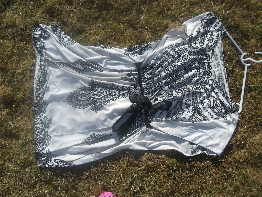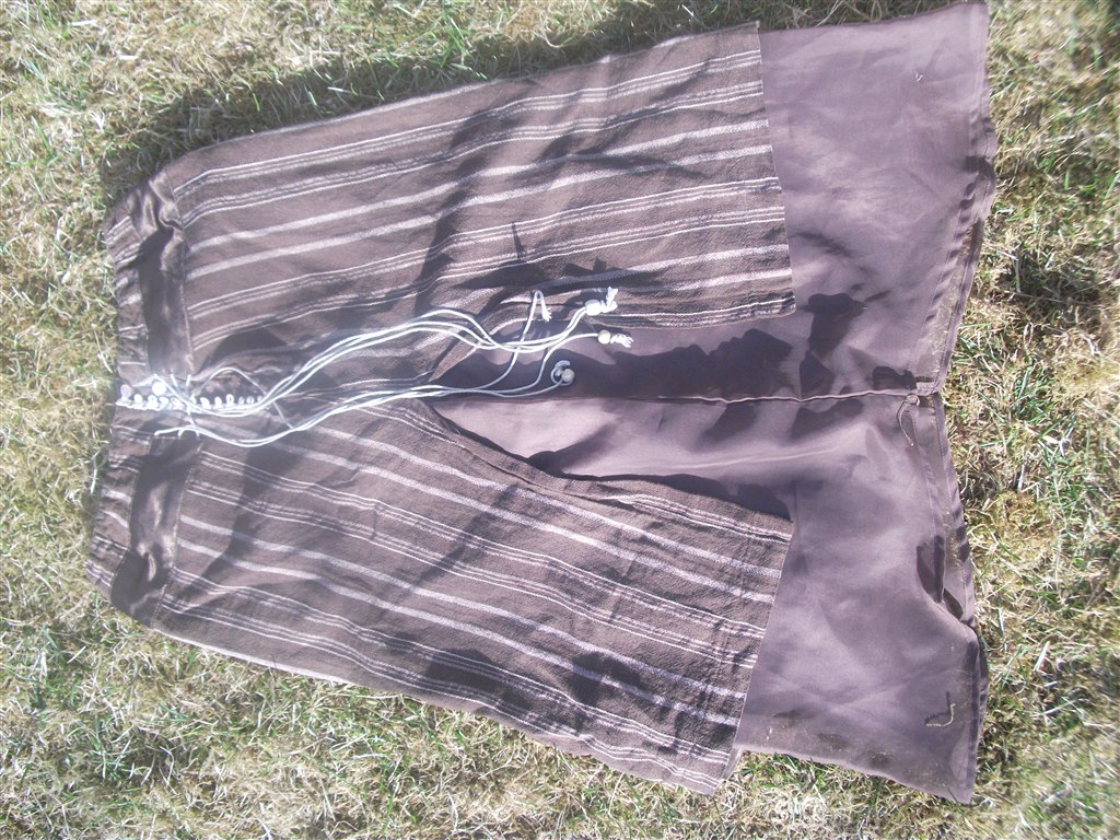 og tilsidst den dejligtste tunika/kjole dims der skal bindes på ryggen. den hænger så smukt på én især hvis man er gravid. fik så meget opmærksomhed når jeg havde den på. det er viudst en one size, købt på en tailansk markedsbod. nypris 100 kr, din pris 25 kr. bemærk: en snøre til at binde omme på ryggen faldt af og jeg syede den fast igen, hvor jeg opdagde jeg havde sat den forkert men det betyder ingenting og man lægger ikke mærke til det.