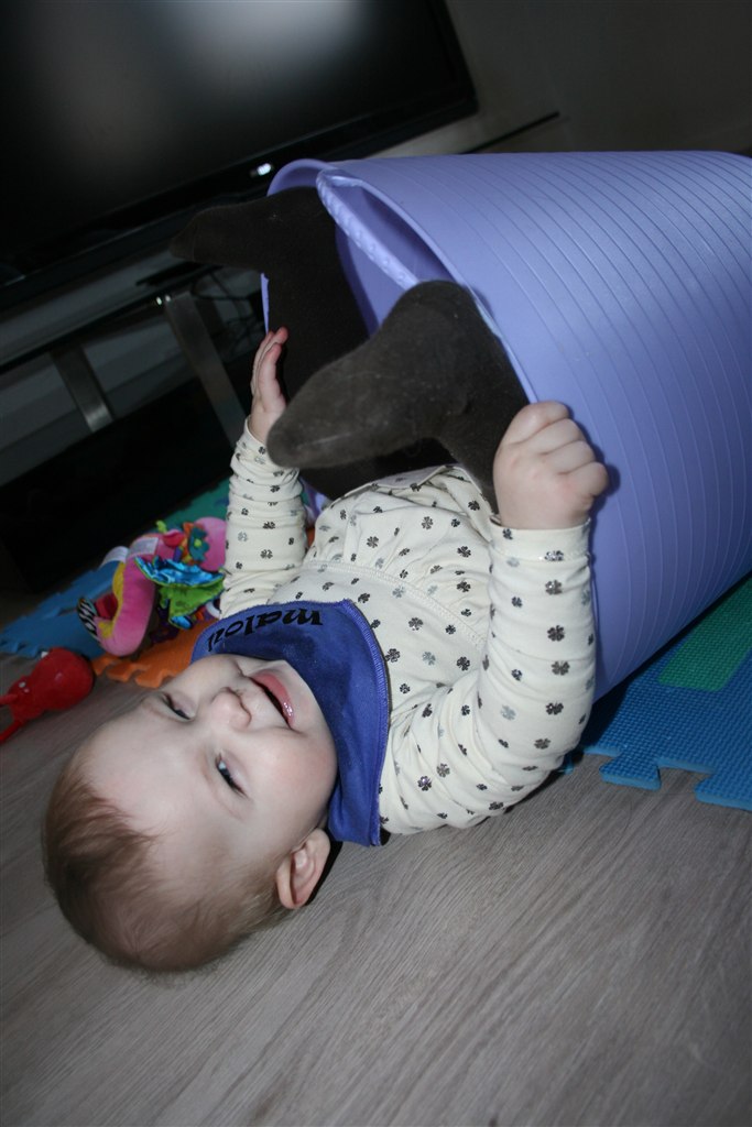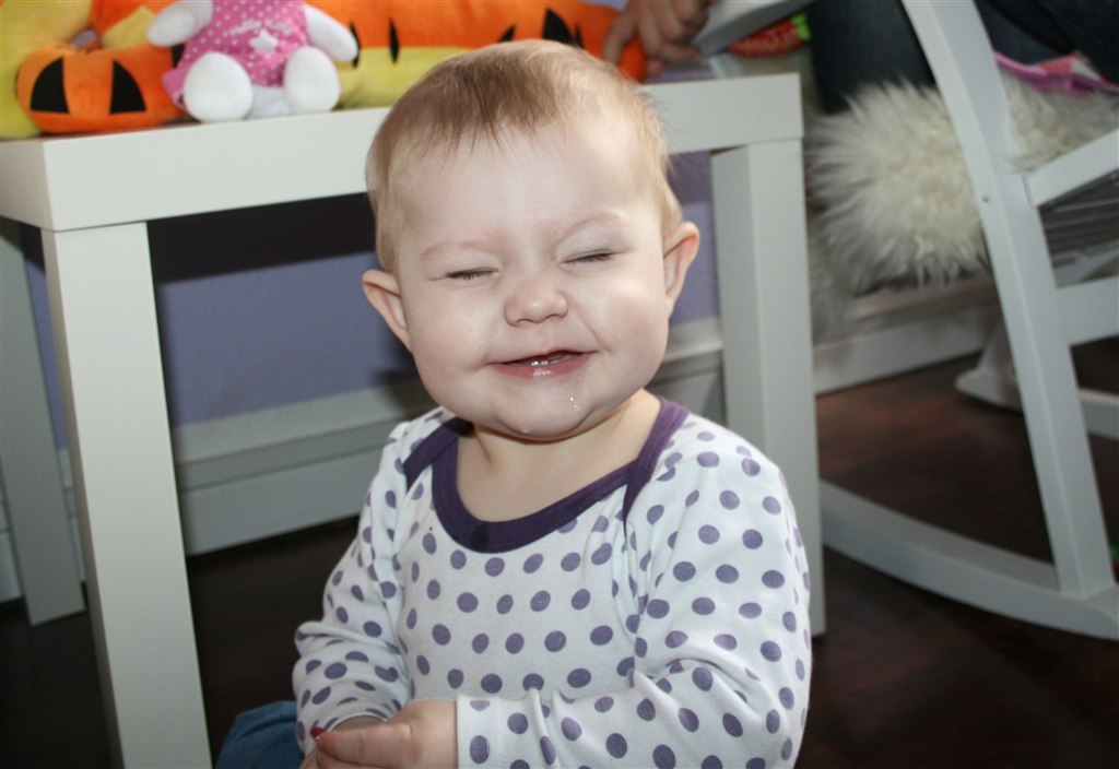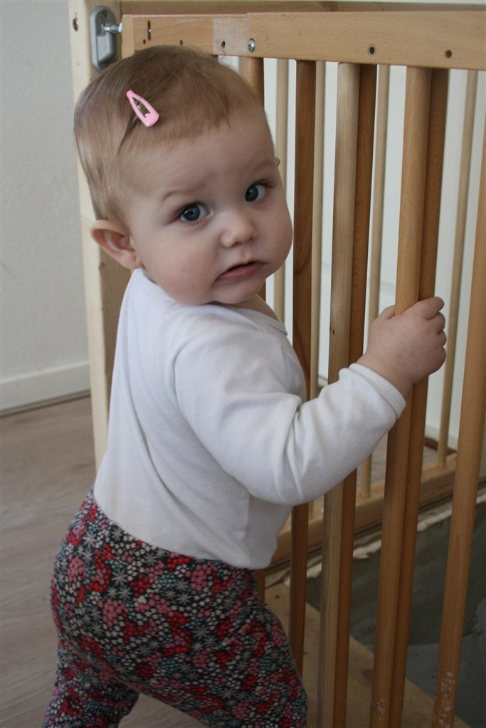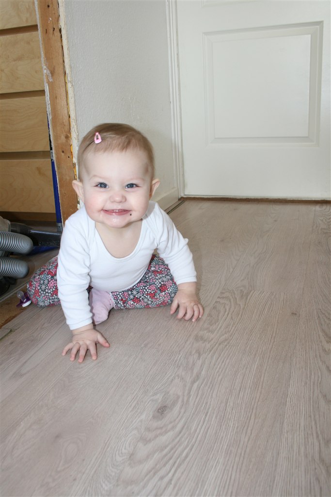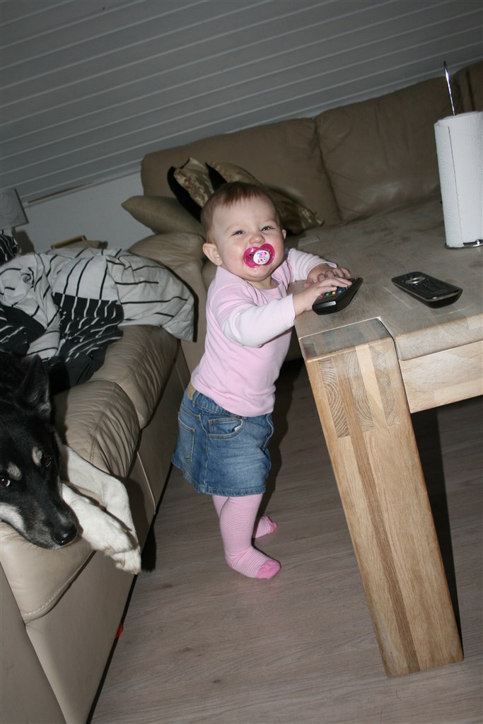 Malou kan nu kravle og stå af sig selv. Hun går lystigt når hun holder i hånd men har endnu ikke turde vove sig ud på egen hånd. Vi har haft store problemer med hendes ører og venter nu på at få lov til at få dræn.