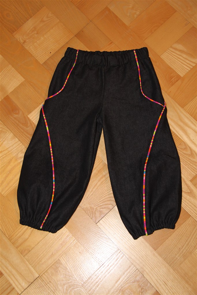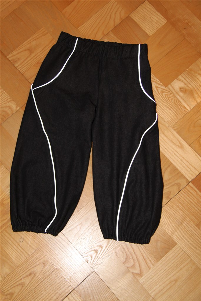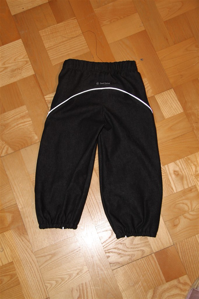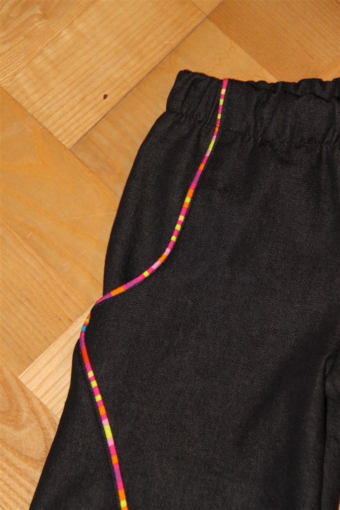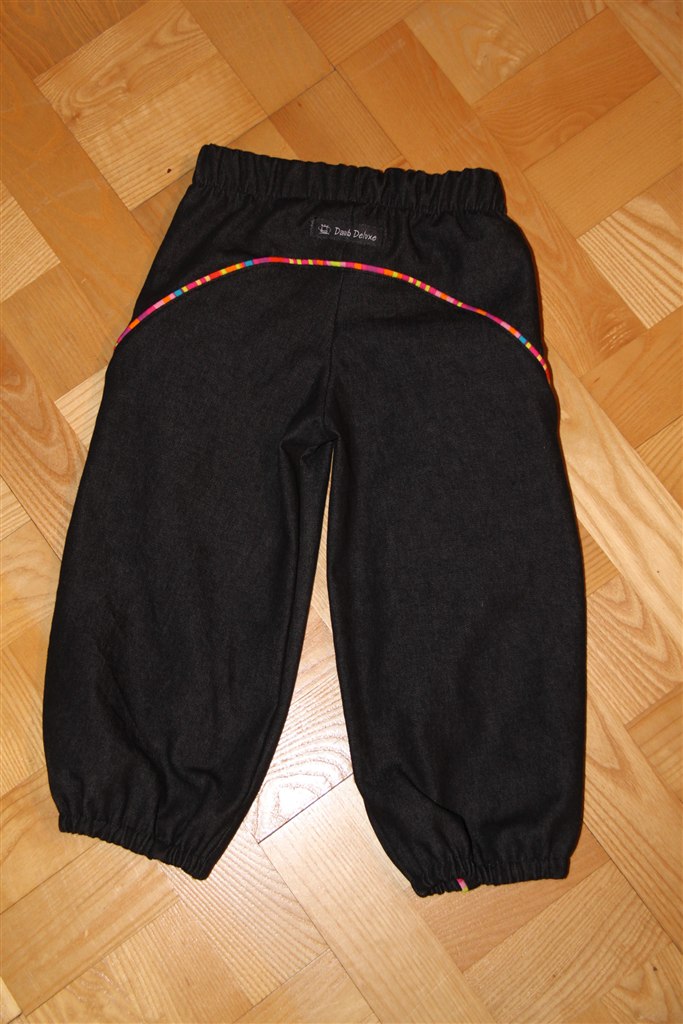 Begge par er i sort denim - det første med en rigtig tøset piping og nummer 2 med refleks bånd. Refleksen er et stort hit herhjemme - det er faktisk par nummer 2 og Freja er HELT ekset med dem "Se mor, mine bukser lyser".