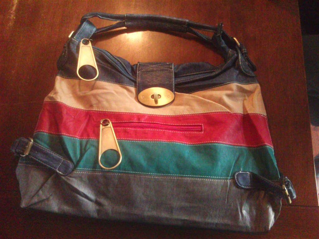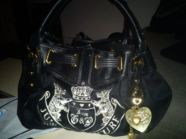 Jeg har en stor sort DKNY taske med sorte DKNY logo´er over det hele, hvis du forstår hvad jeg mener. Tasken har nogle guldfarvede ringe på enden af hver rem. Jeg har desværre ikke et billede liggende af den.