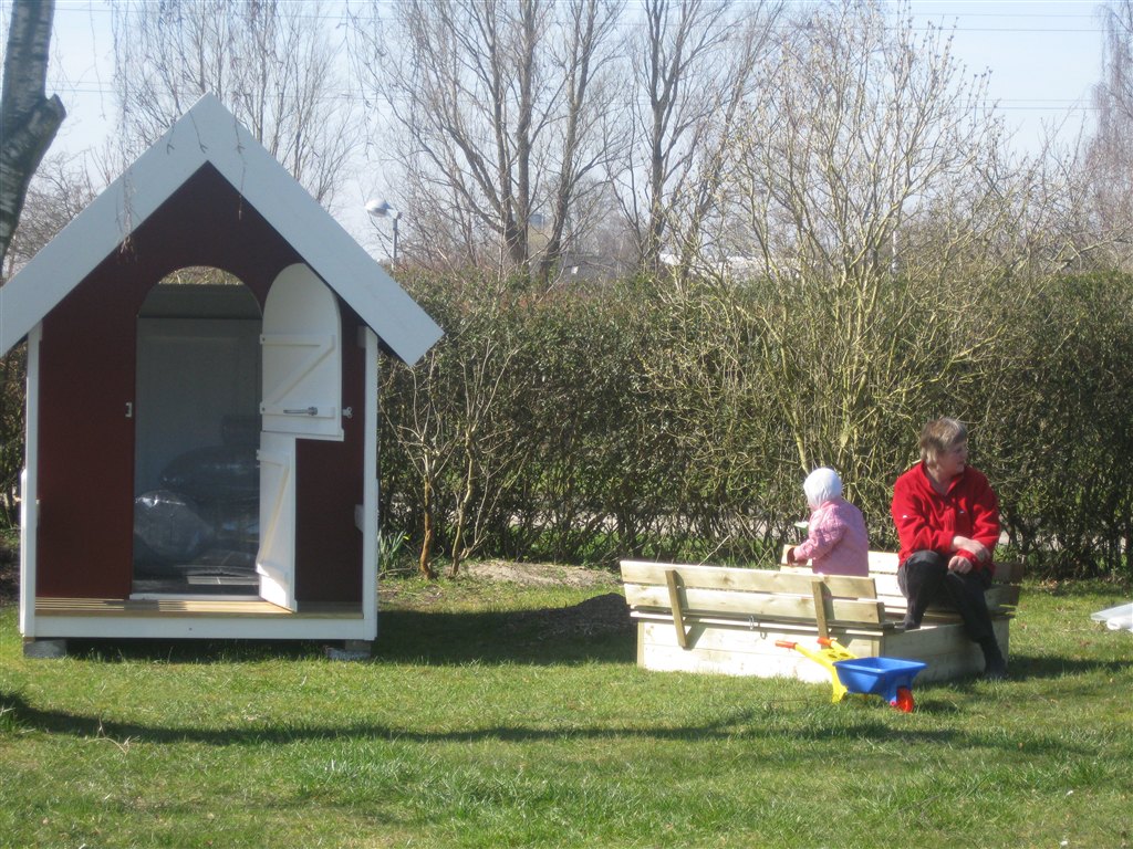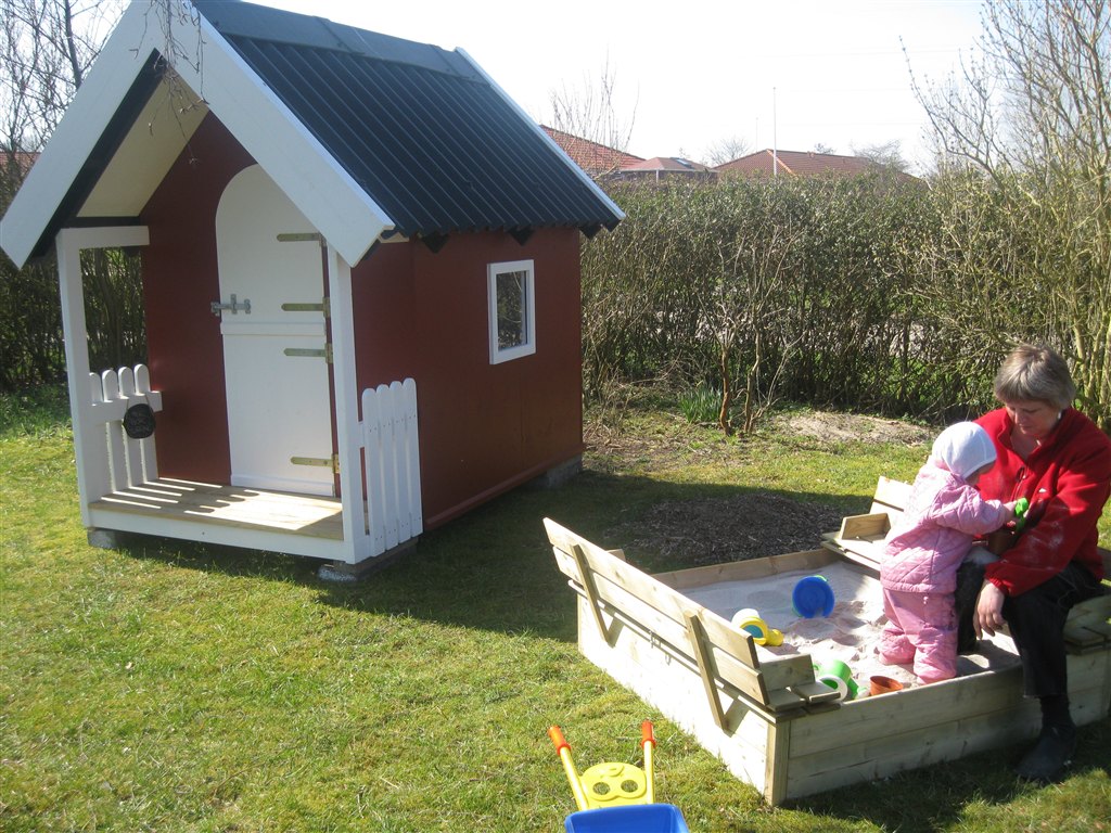 Indenfor har hun 2 bænke, en lille sofa, et lille bord, stor kasse med udendørs legetøj, en reol med legetøj og dukker og så står hendes dukke-barnevogn og prinsesse-motorcykel parkeret ude på terressen også