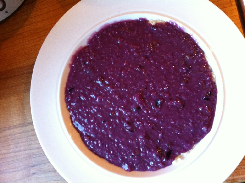 Havregrød med friske blåbær (kogt med) og moset banan.