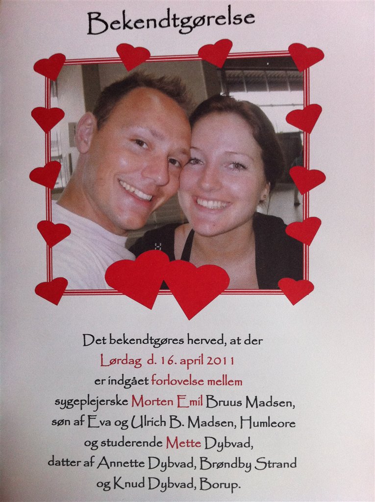 Han gav mig et dejligt stort knus. Det gør han tit, så det fik mig ikke til at mistænke hvad der nu skulle ske... Han begyndte at fortælle mig en masse dejlige ting om vores forhold og hvad jeg betød for ham. Han opremsede hvilke store beslutninger vi har taget sammen, netop ved dette sted, og det var så her hans stemme knækkede, og han med skælvende stemme og tårer i øjnene rakte hånden i lommen, mens han faldt på knæ og sagde at "derfor kunne jeg heller ikke forestille sig noget bedre sted at spørge dig om du vil gifte dig med mig?". Jeg kunne ikke holde tårene tilbage, og sagde at selvfølgelig ville jeg gifte mig med ham, der er jo ikke noget i verden jeg hellere vil. Han rejste sig fra den våde asfalt, og tiden stod stille. Vi stod bare der i småregnen, ham og jeg, som om intet andet i verden eksisterede. Kyssede og var komplet overvældet.
