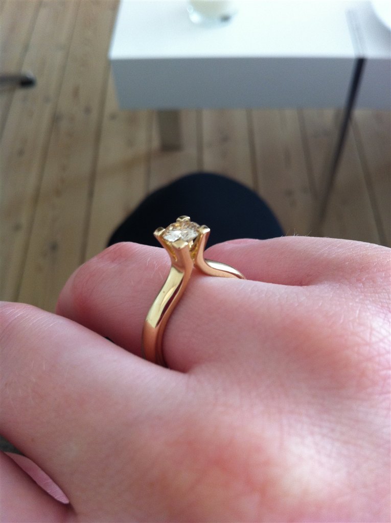 [...] Ringen er lavet i rent 14 karat guld fra både ringen og halskæden samt den største brilliant på 0,60 carat. Brillianten er let gullig, hvilket jeg synes fremhæver ringens skønhed.