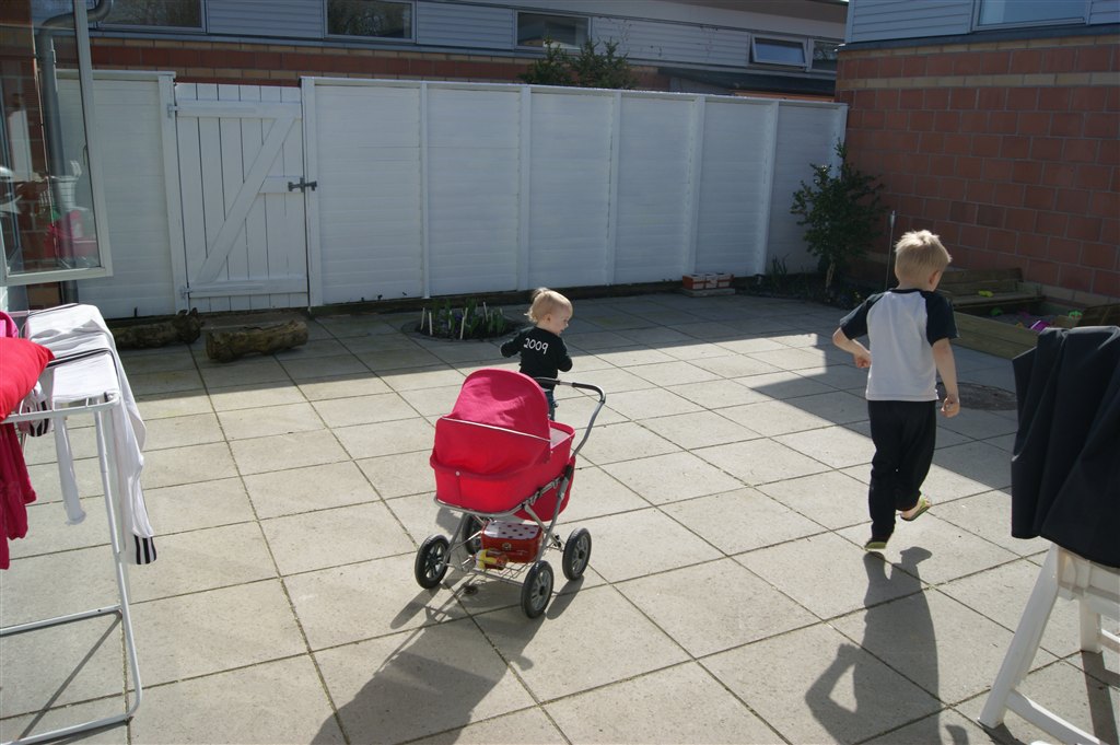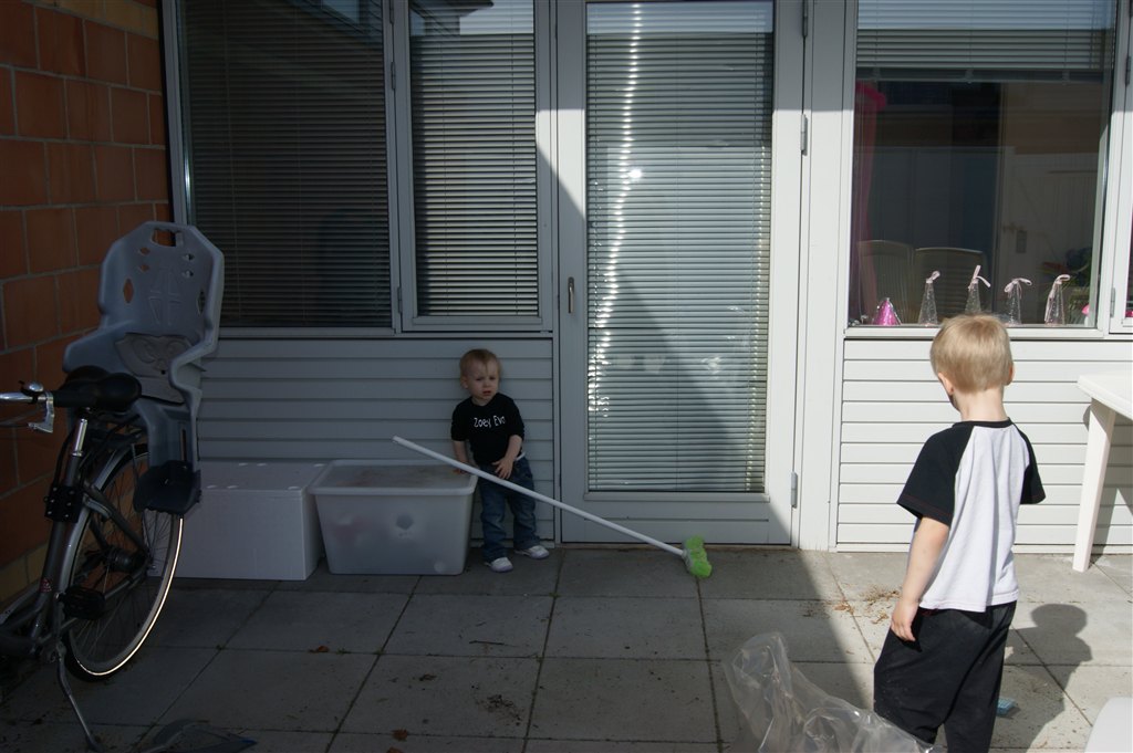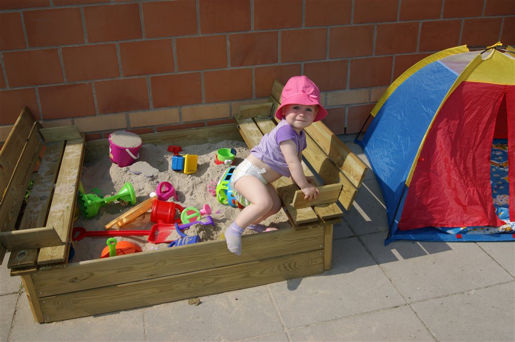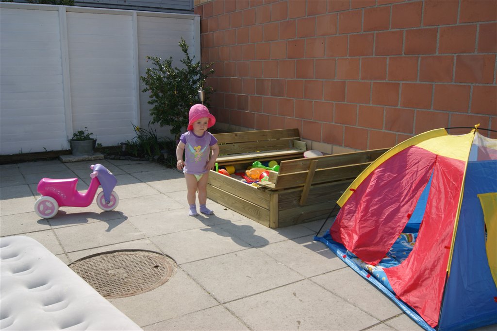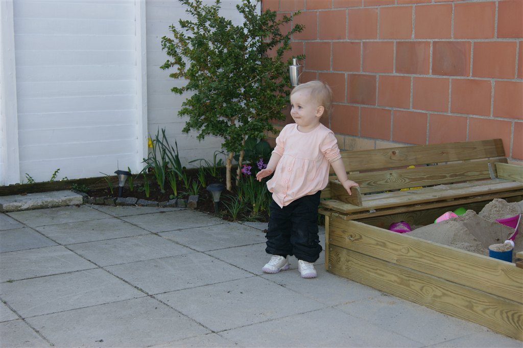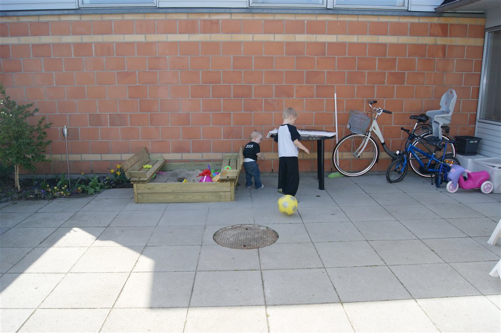 Vi har en vippe, en grøn plastik sandkasse med låg, en gynge og en lille rutchebane i vores lillebitte have. Og så har vi 6 forskellige scooter/cykel/traktor/løbehjul - køretøjer, som de kan fræse rundt på.