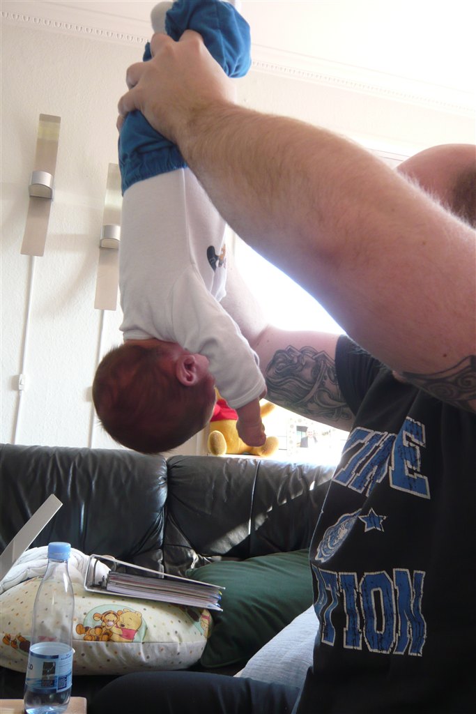 Hvornår må baby vendes med hovedet nedad under leg? - Ikke for at bære ham i et ben eller noget, men fx på gymnastikbold eller som et "stille løft" fra underlag, hvor han så hænger med hovedet ned få sekunder inden han lægges stille igen?