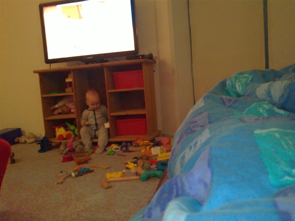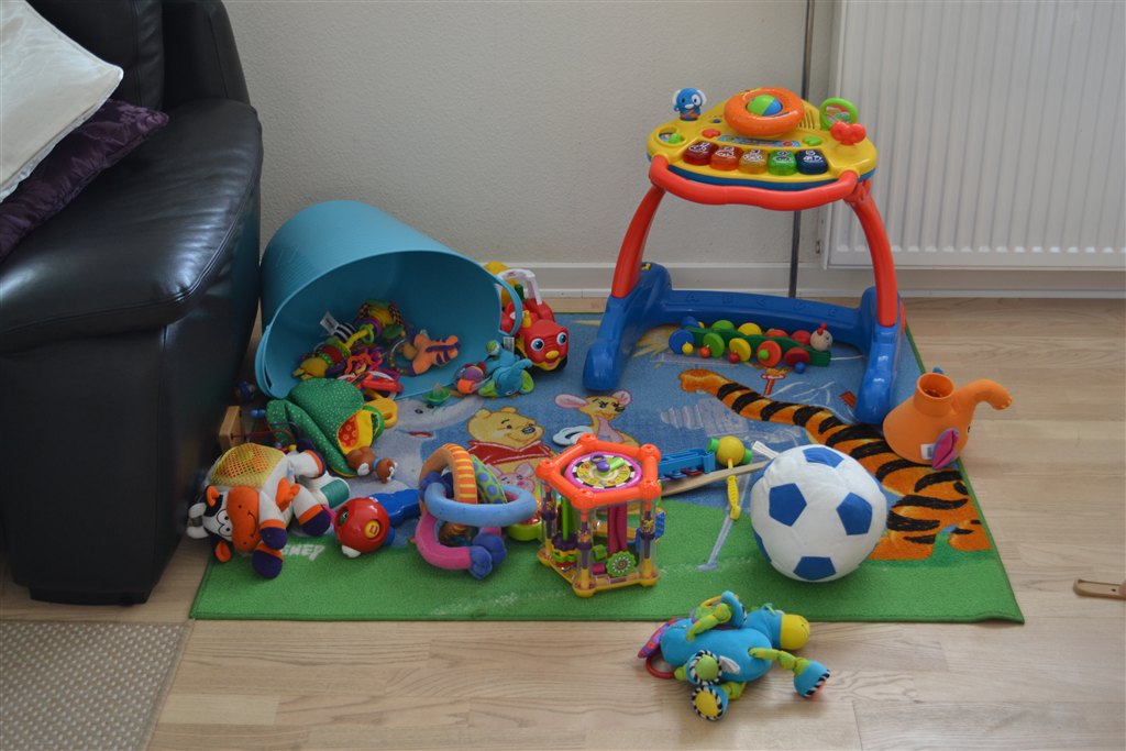 Vi har ved siden af sofaen et tæppe med en MASSE legetøj på så han er "tæt" på os....