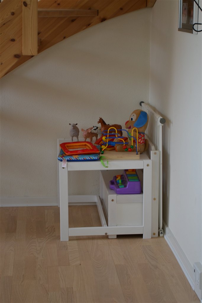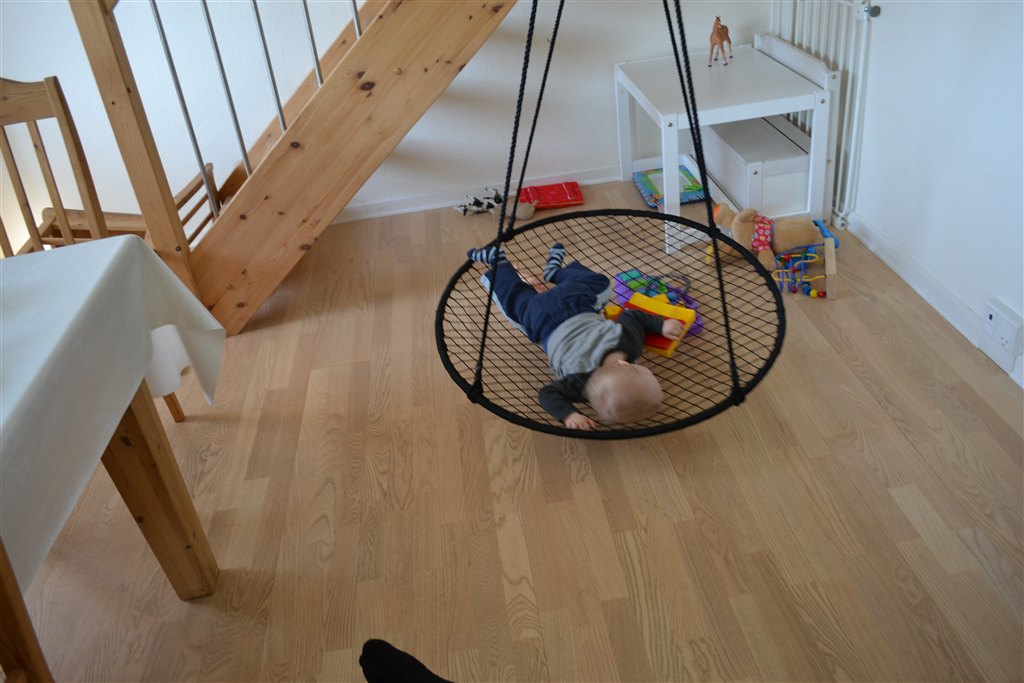 så under trappen skal der være hyggehjørne! med et borde-bænke sæt og der skal hænges lampe op osv... Han er ikke så stor endnu til at bruge det helt endnu, men det er gjort lidt klar! og så har vi sansegyngen midt i stuen (som han er faldet i søvn i på billedet).... den tager vi ned og gynger ham i.. og den kan hives op ovenpå når vi ikke bruger den