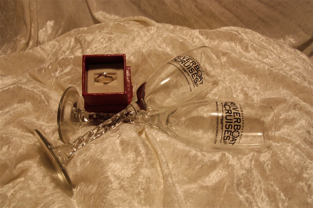 Billedet er ikke vildt tæt på ringen, da vi tog det med de champagneglas, som vi drak af den aften, og som skal med til brylluppet..