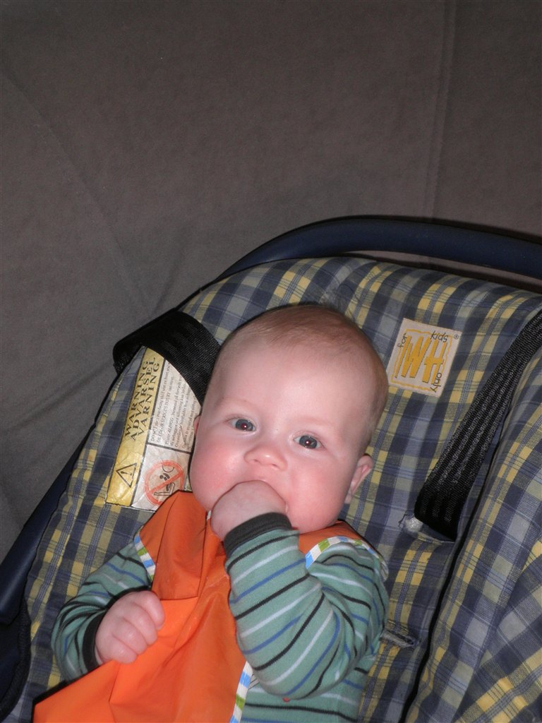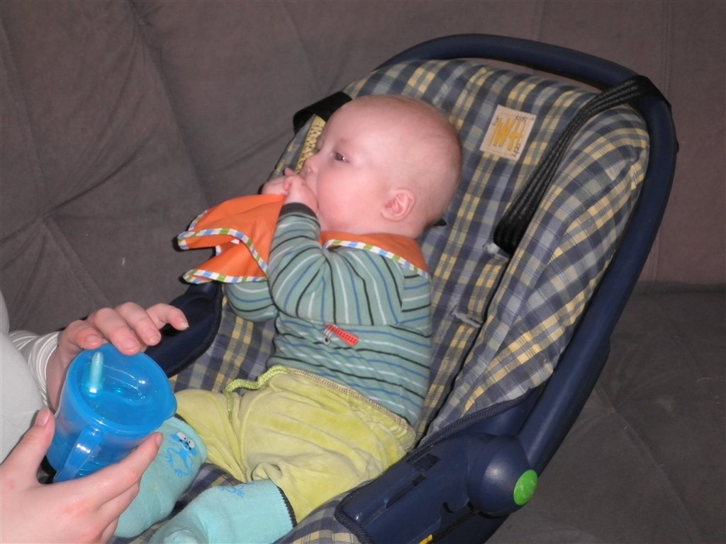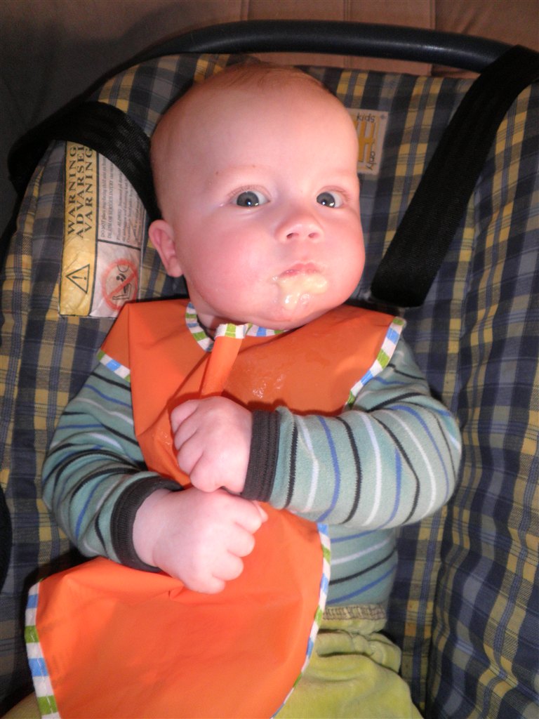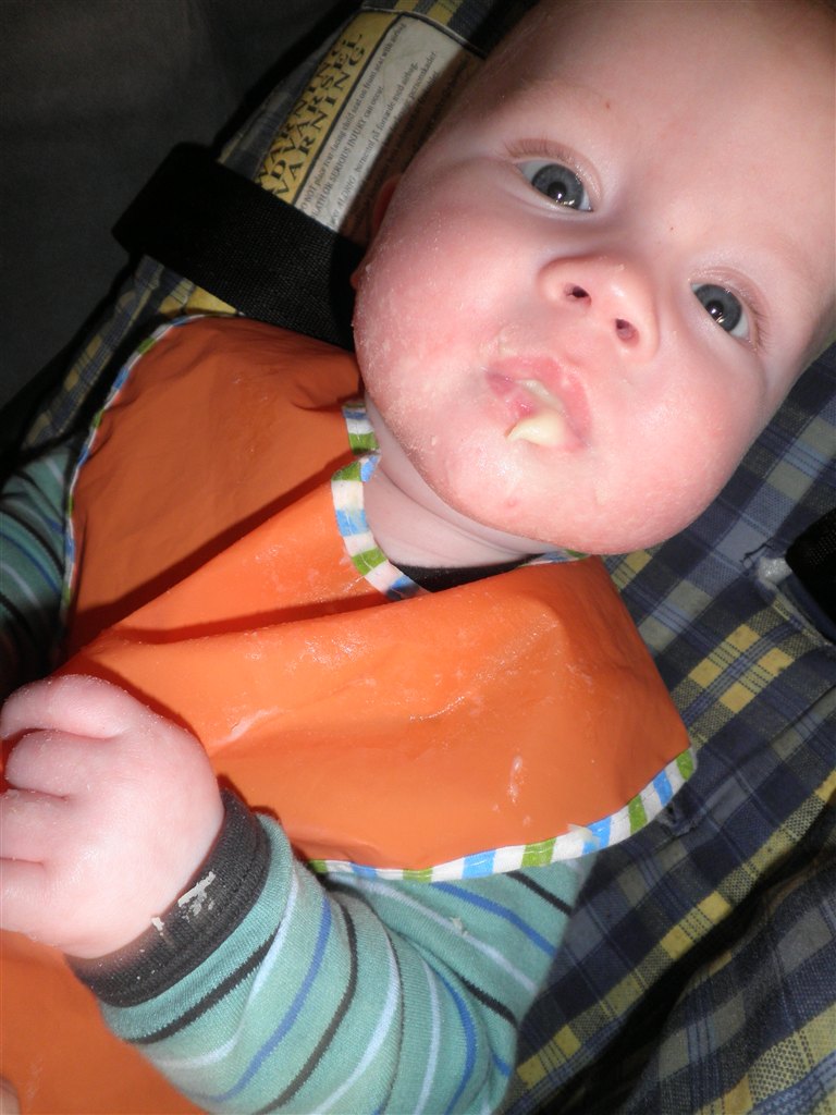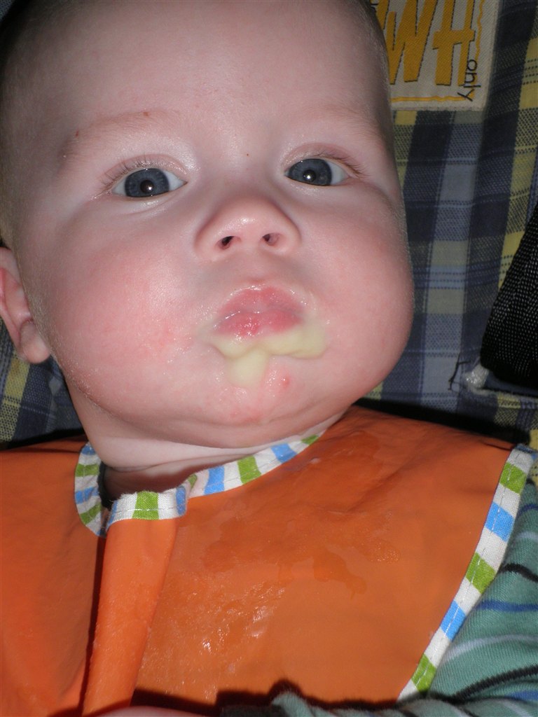 Okay. Vi startede også med hirsegrød men løb så desværre tør for hirsemel og prøvede med risgrød men frugtmos men det ville han overhovedet ikke smage på , sådan en lille bandit