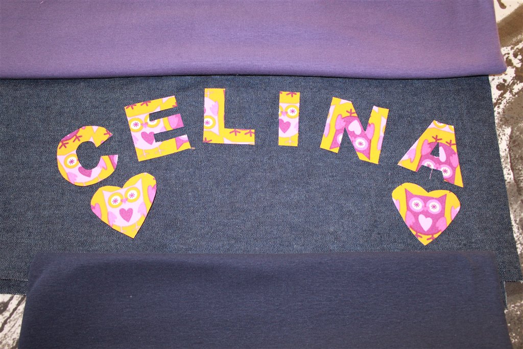 bogstaverne bliver stukket i kanten med lilla som ribben, det samme med hjerterne..