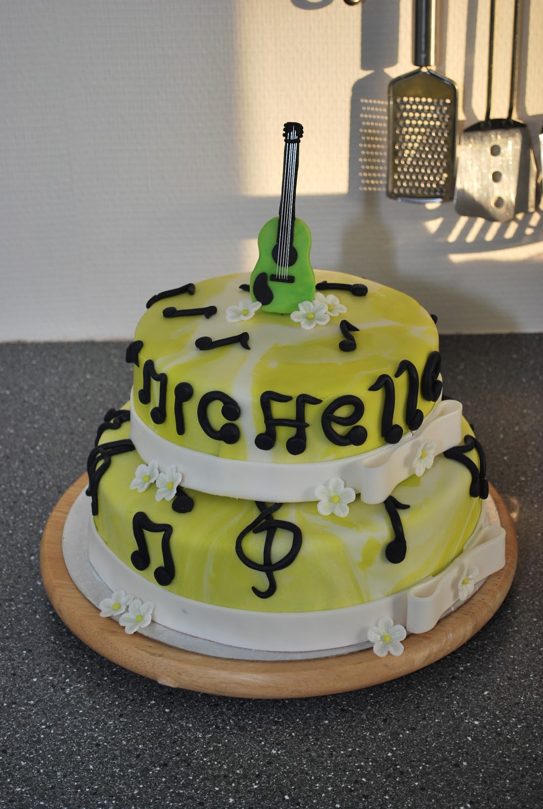 Den 1. er til en musikglad pige, og hun bestemte selv at farverne skulle være limegrøn, sort og hvid og så skulle der være noder og en guitar. Her er mit bud: