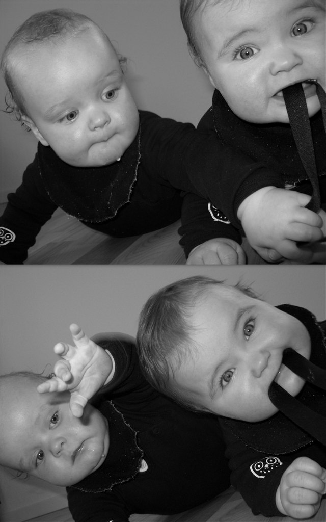 Alvin begyndte at kravle i går - Viola møver sig stadig frem på albuerne. De er ALLE VEGNE. Det legetøj eller bordben den ene står og hiver i skal den anden også have fat i. De er begyndt at slå hinanden. Dvs. Viola slår Alvin.. haha.