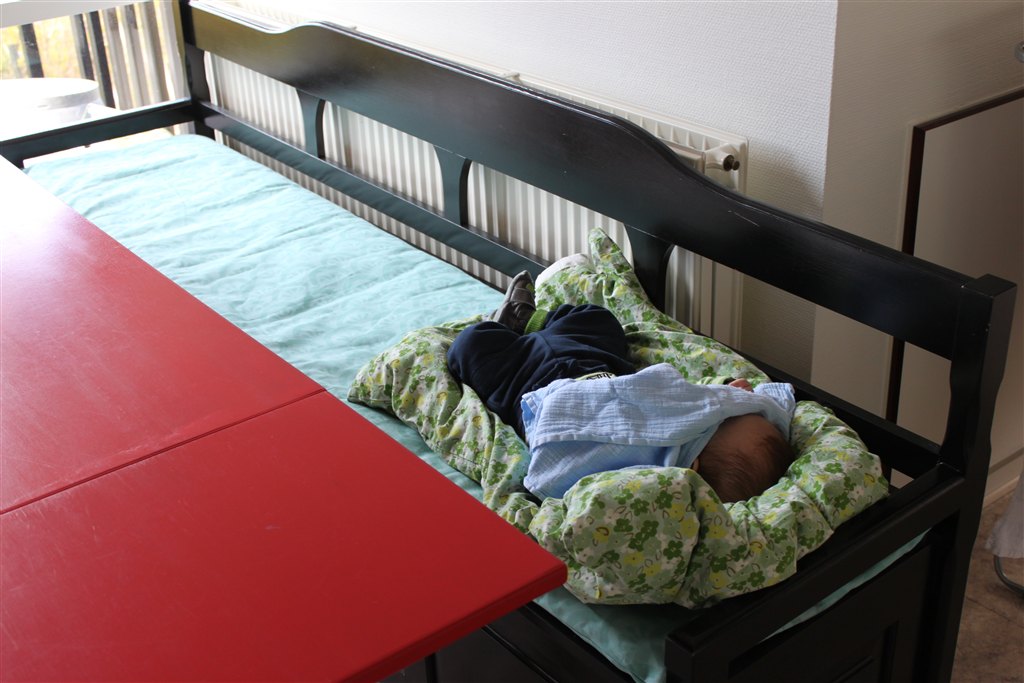 Jeg lagde ham der, fordi han var på opvågnings/måske-sovevidere-men-i-hvert-fald-ikke-alene-stadie og jeg lige lagde det sidste tøj sammen inden jeg ville tage ham med videre ind i sofaen og putte. Og jeg er ved siden af af hele tiden og holder øje med, at han ikke triller ned, så bare rolig til alle jer der også begynder at have trillende bebser