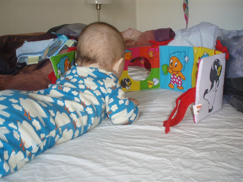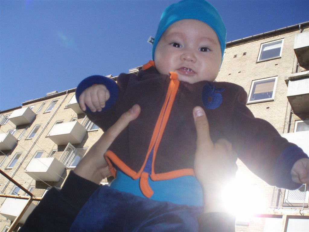 Vi har i dag haft besøg af sundhedsplejersken. Hun målte ham til at være 66 cm og vejede ham - 7,7 kg. Han ligger midt på gennemsnitskurven mht længde og omkreds af hovedet og lige en enkelt kurve over gennemsnittet i forhold til vægt. Det har han gjort siden han var en mdr, så han følger sin egen kurve helt fint. SPen var helt igennem tilfreds med ham - han startede selvfølgelig også ud med at charme hende med et stort tandløst grin. Jeg har været noget nervøs for at han ikke var god nok til at ligge på maven - han har jo ikke trillet fra mave til ryg endnu osv. Hun beroligede mig heldigvis, men bekræftede dog at vi skal træne det noget mere. Helt ok med mig, bare dejligt at han ikke er bagud.