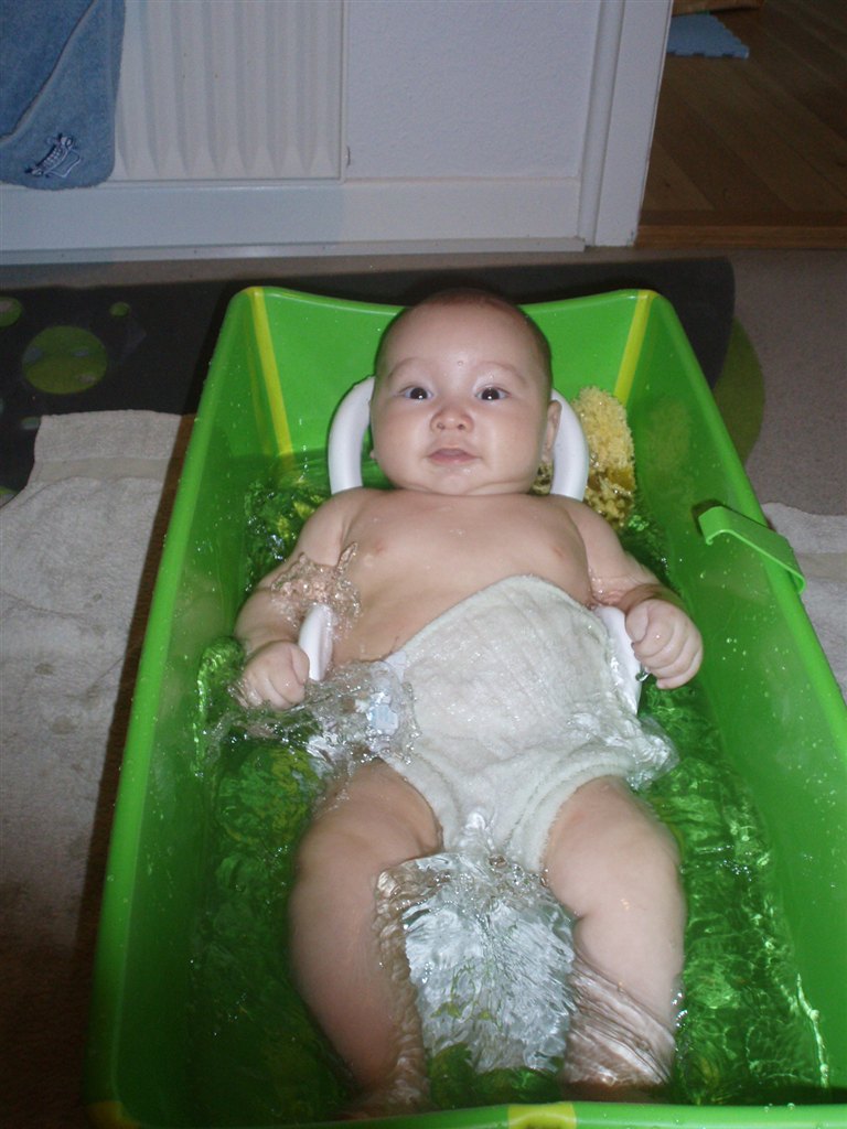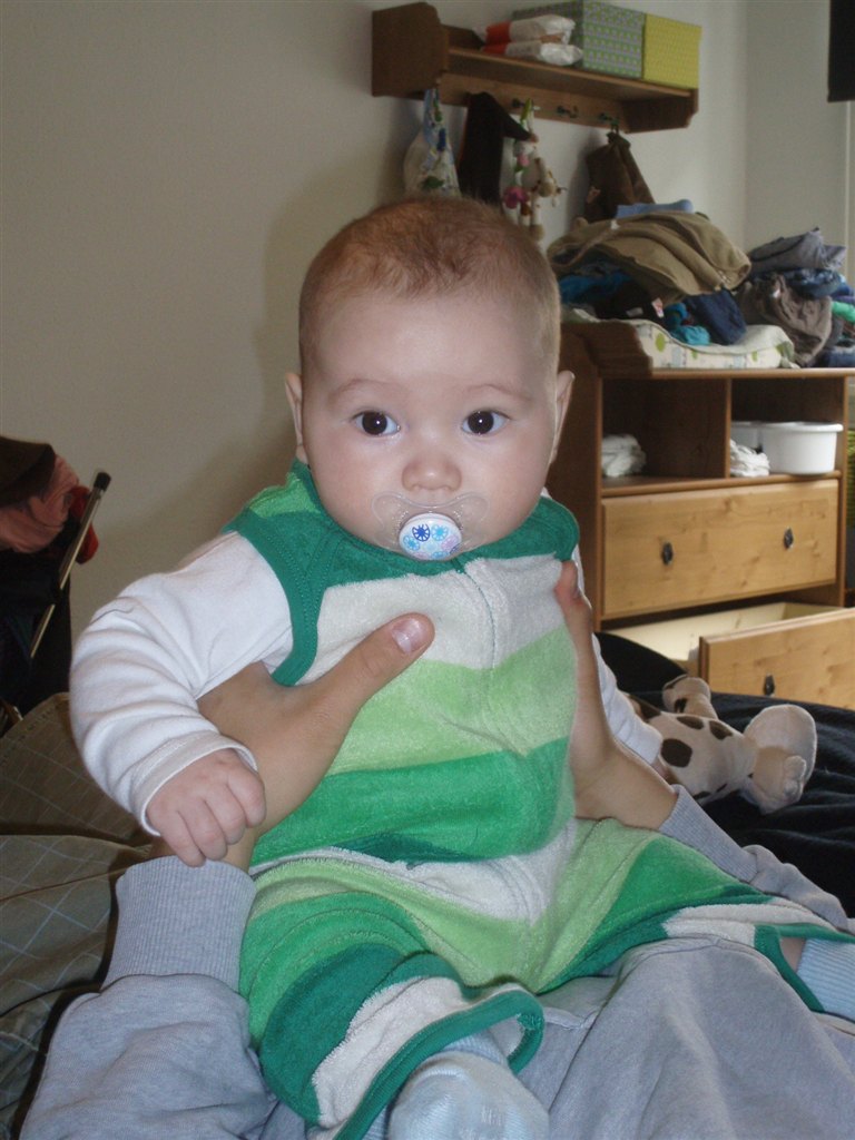 Hun anbefalede at vi venter lidt med at starte op med grød. Han er godt nok blevet lidt mere sulten, men ikke så meget at madkasserne ikke kan følge med, og han virker ikke specielt interesseret i den mad vi spiser. Det passer mig fint - der er nemlig et stykke vej ned i str. 38 som ellers er den tøjstørrelse vi har aftalt at han skal suge mig ned i.