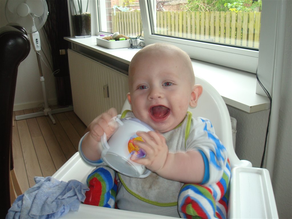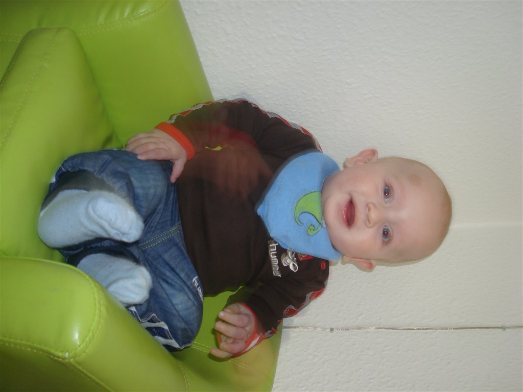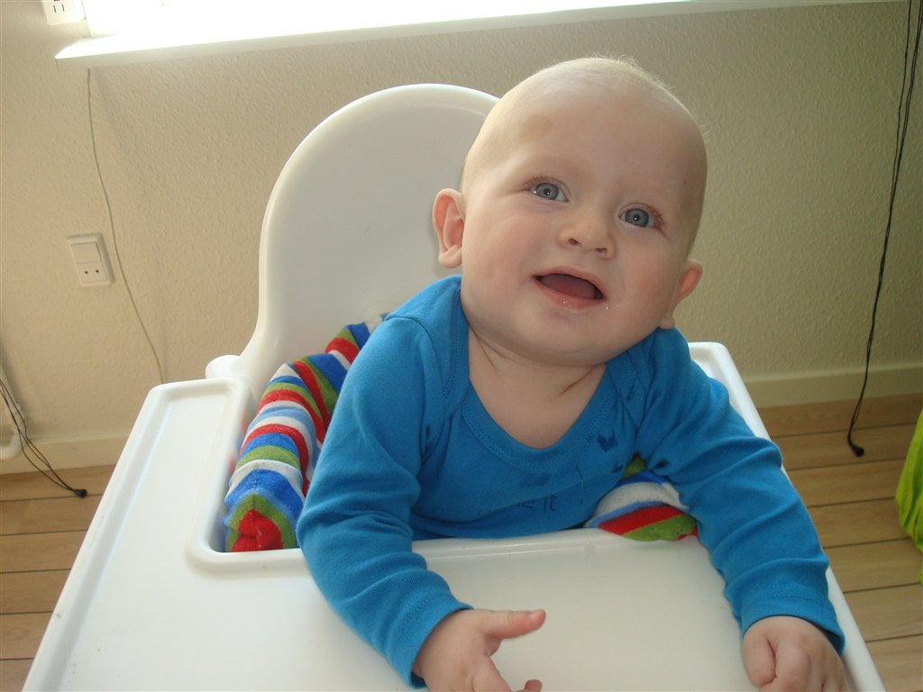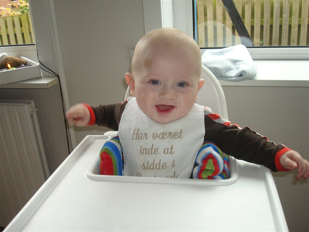 .. Der kommer flere og flere lyde og mumleord agtige lyde ud af hans mund, han savler igennem 10 hagesmækker om dagen som han har gjort siden han var 4 måneder. Hans afførringsmønster bliver bedre og bedre. Han kan sidde i højstol med pude omkring sig når han får grød og han ELSKER det