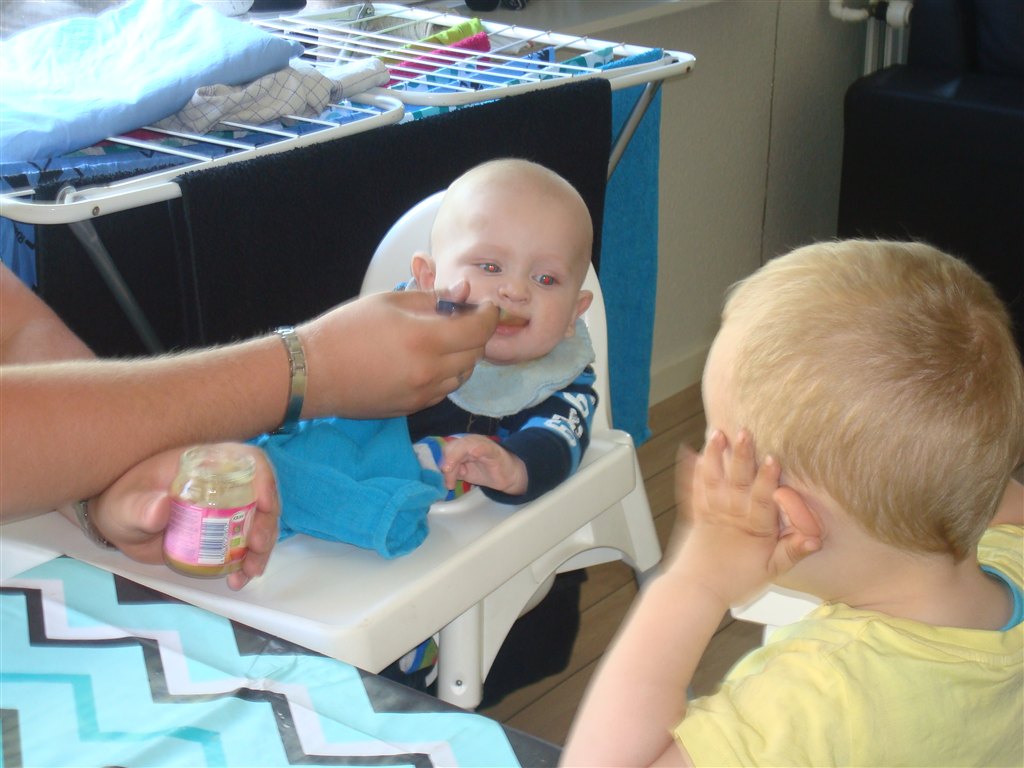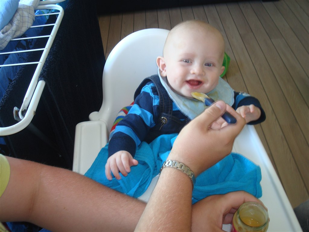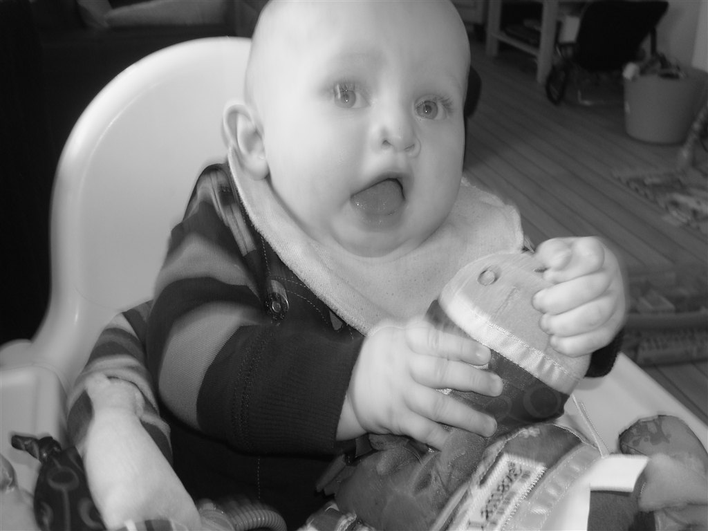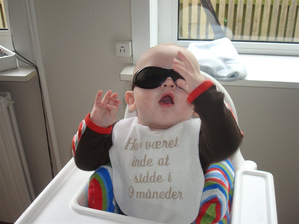 .. Der kommer flere og flere lyde og mumleord agtige lyde ud af hans mund, han savler igennem 10 hagesmækker om dagen som han har gjort siden han var 4 måneder. Hans afførringsmønster bliver bedre og bedre. Han kan sidde i højstol med pude omkring sig når han får grød og han ELSKER det