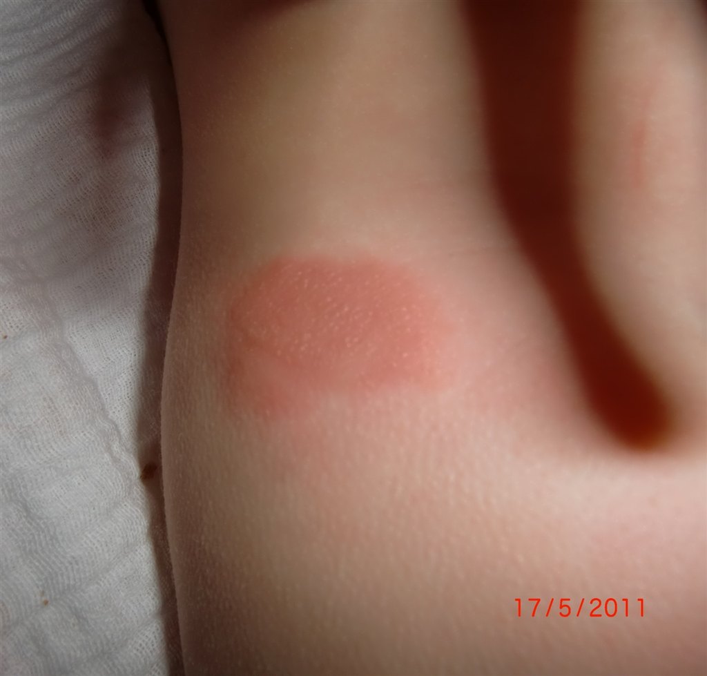 Da jeg kom og hentede Runa fortalte en ansat, at min datter havde et mærke nede ved blekanten. Det var der ikke i morges så jeg tænker, at det er noget udslæt, måske fra deres ble...