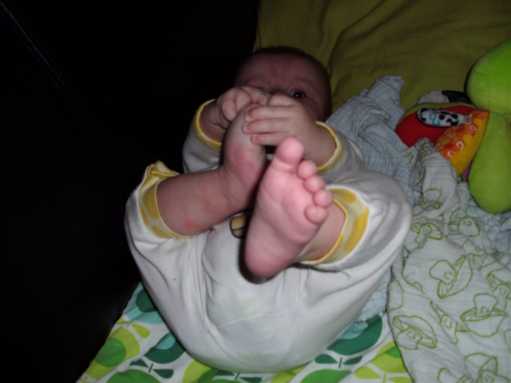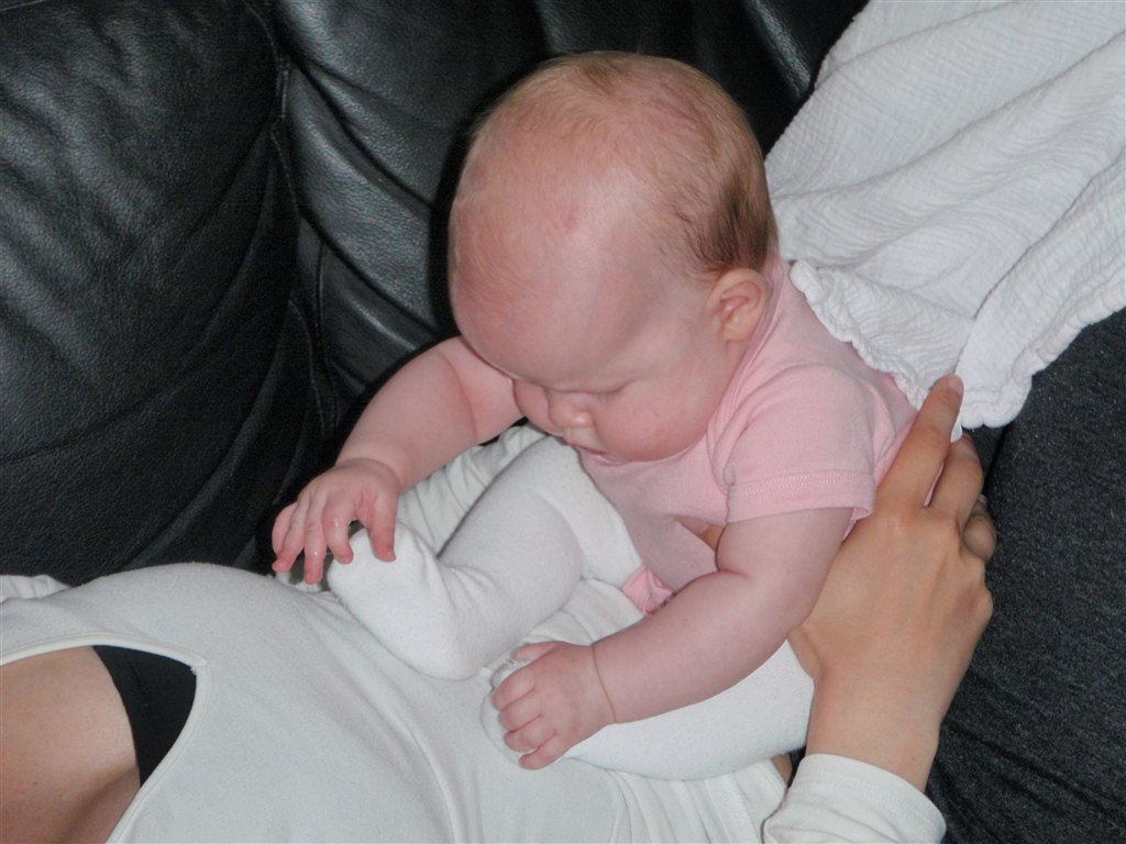 Alberte "fangede" sine fødder for første gang igår. Indtil nu har hun ellers kun kigget et par gange. Hun har dog ikke vist interesse for dem, når hun ligger ned. Det kommer nok alt sammen.