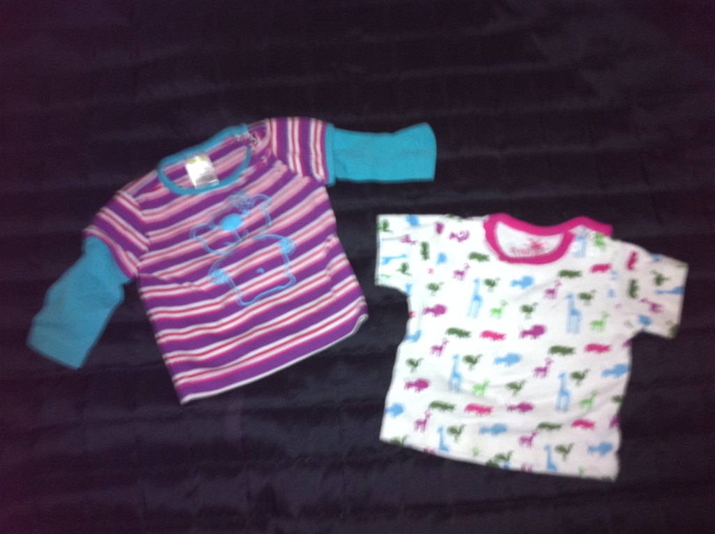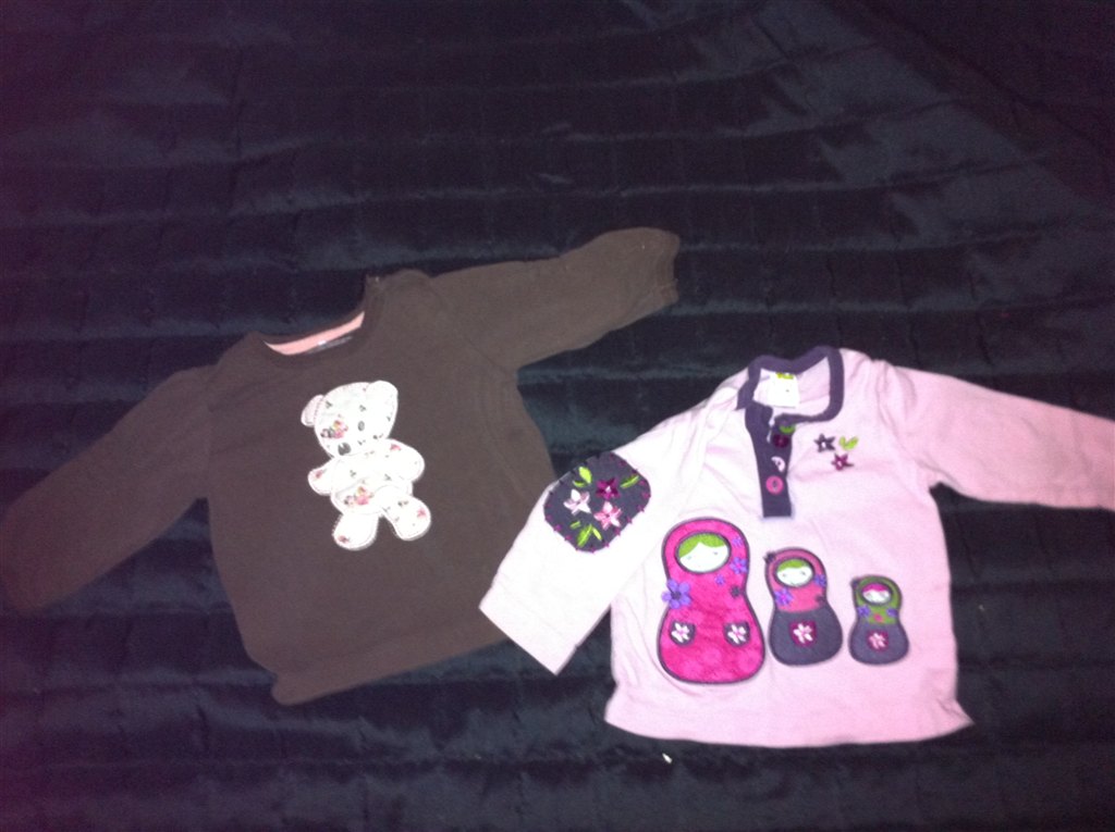 Venstre: Name it brun trøje med lyserød bjørn // GMB Højre: Friends lyserød med babushkaer og lapper på albue // GMB