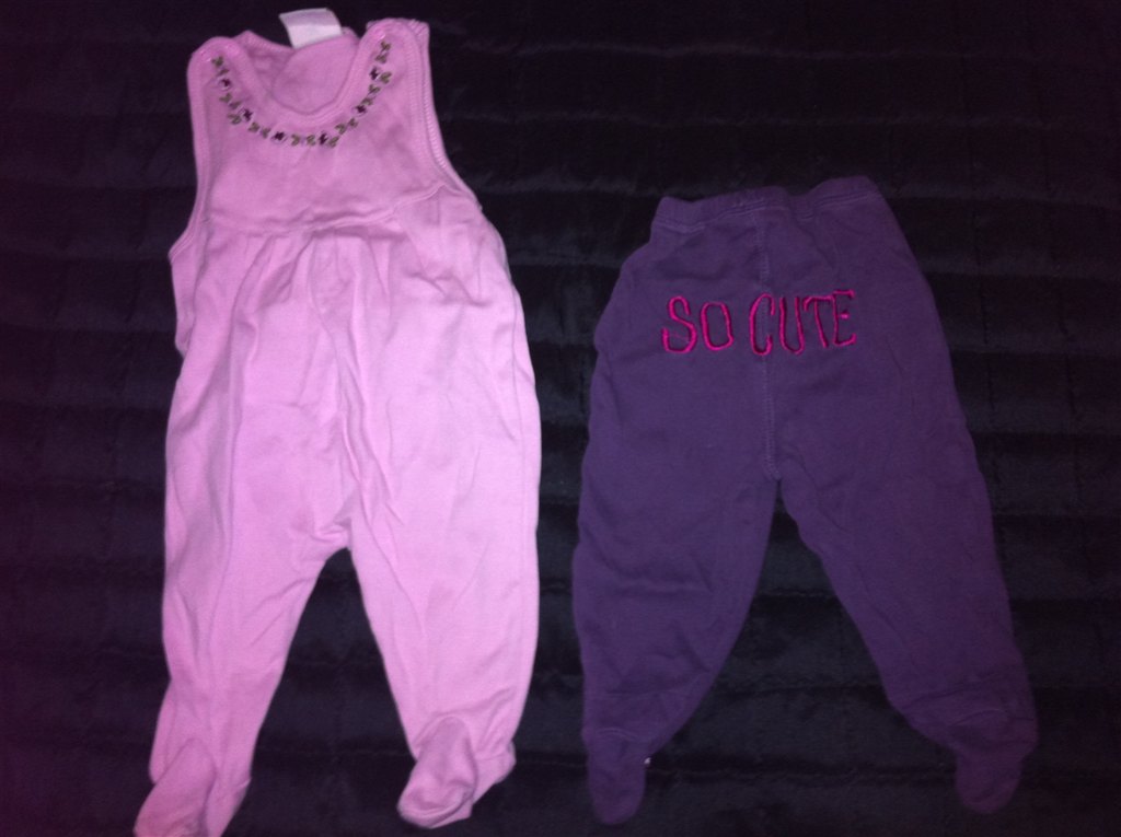 Venstre: Fixoni lyserød heldragt m. fod // NSN Højre: Friends buks m. fod og tekst "so cute" på numsen // GMB