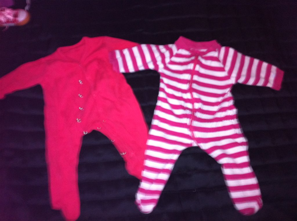 Venstre: Friends natdragt m. fod i hindblærrød // GMB(obs! str 56, men meget stor så svarer til 62) Højre: Mads og Mette natdragt m. fod i stribet rød og hvid // GMB(obs! str 68, men lille i det så svarer til 62)