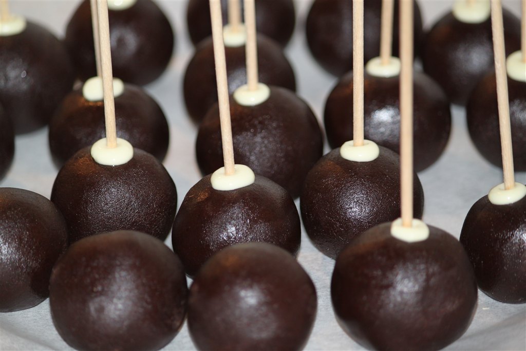 Jeg bruger bare chokolade kage rester og smørcreme så lige en tur i køkkenmaskinen og vupti så har man en dejlig dej man ruller og sætter på køl i 1 time så kan de sættes på pind og overtrækkes og pyntes