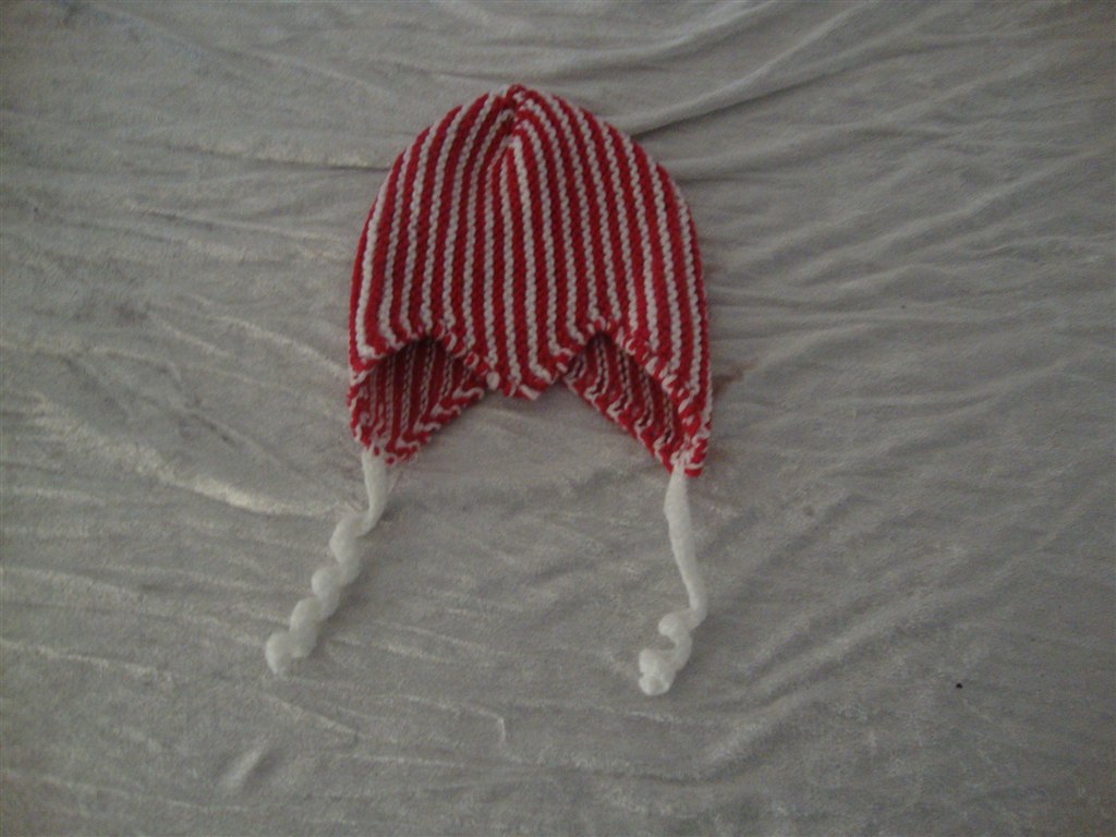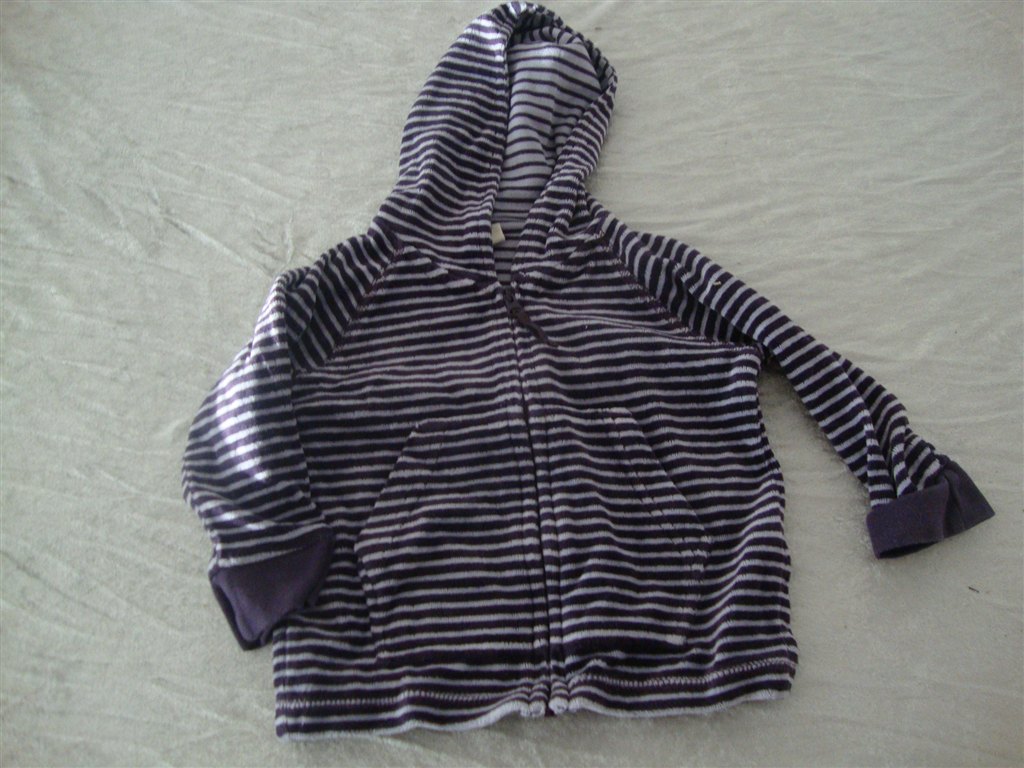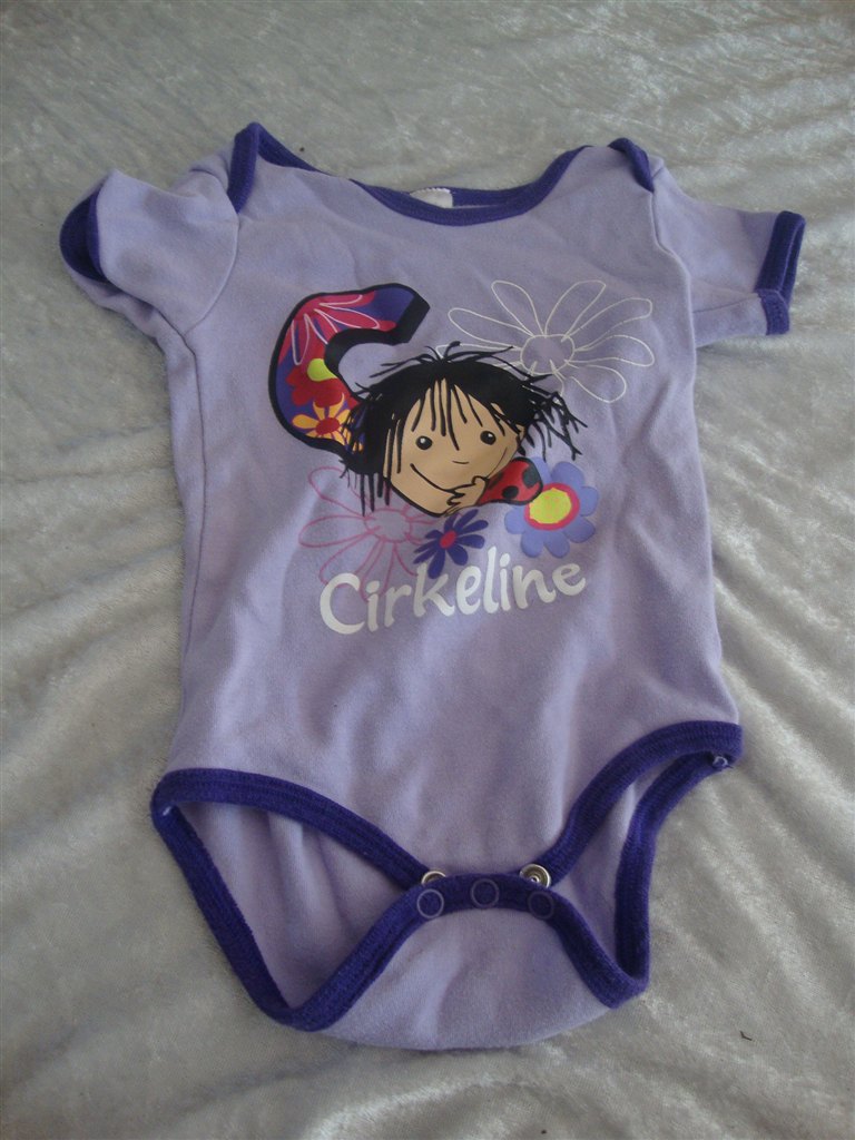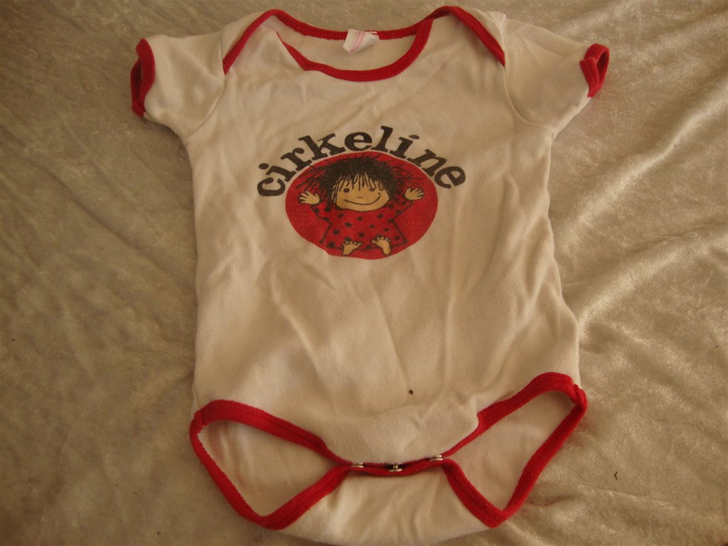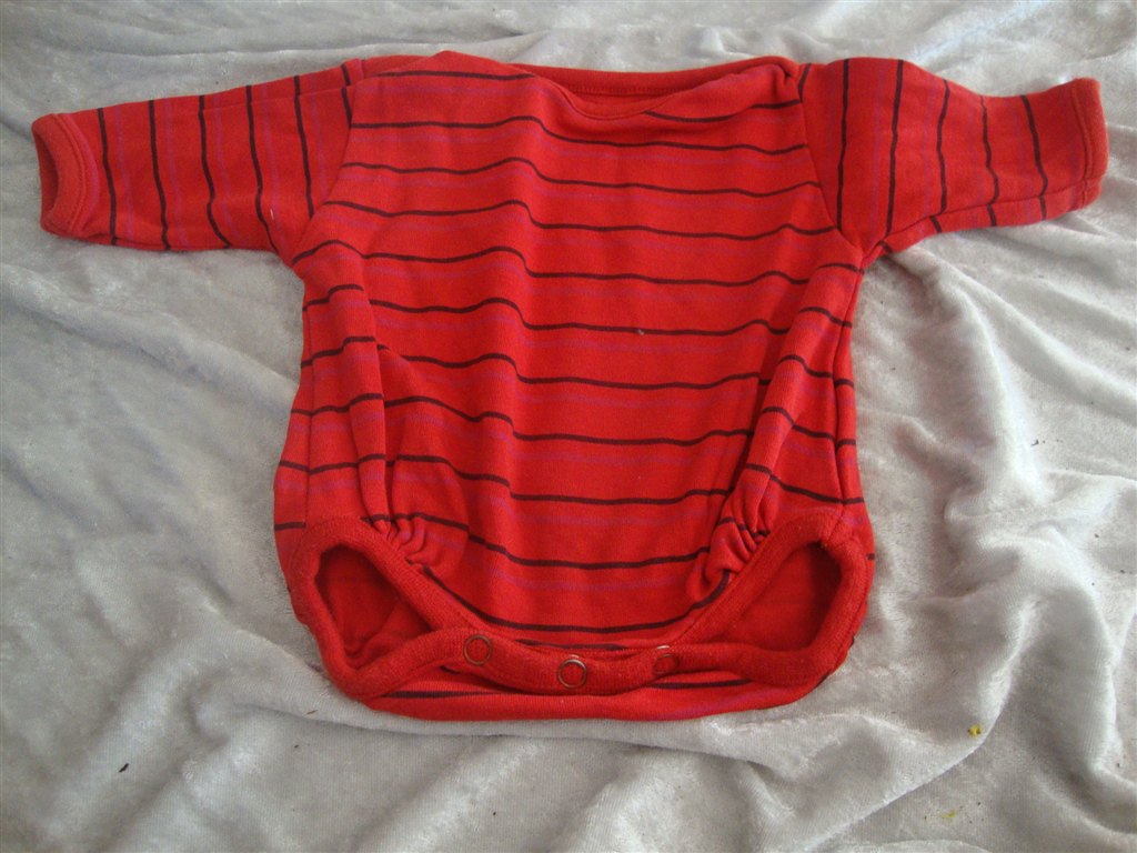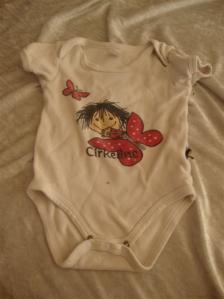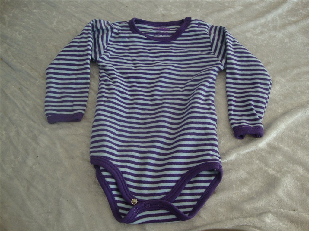 Jeg har fundet tøjet frem. Det skal lige siges at striktrøjen er lilla og creme og ikke hvid.