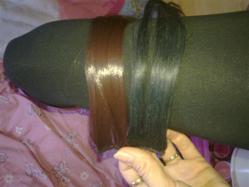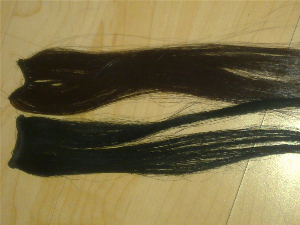 på billedet kan håret godt se sort ud, derfor har jeg taget en sort tot hår og holdt ved siden af den brune, så i netop kan se at håret er BRUNT og IKKE sort...