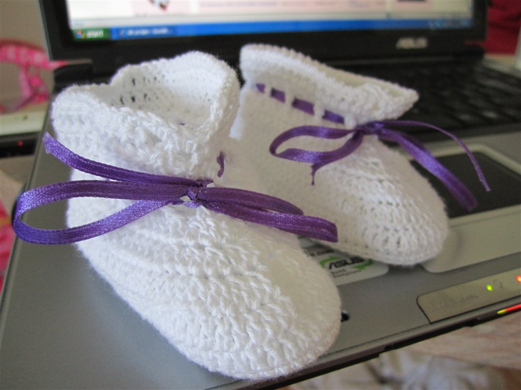 Hæklede hvide sko , med lilla bånd (båndet kan nemt skiftes ud med en anden farve , det gjorde jeg)Brugt i cirka 2 timer ..