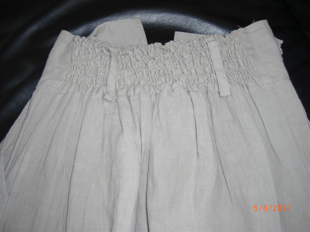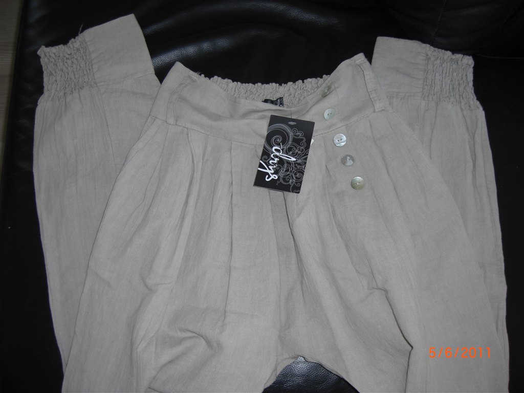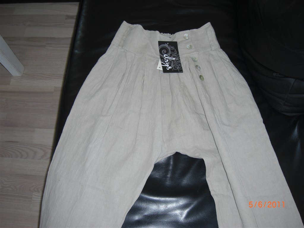 Bukserne er str M, stoffet er halvt bomuld og halvt lino??, i baggy-stil med fede knapper foran. Der er elastik bagpå (se billedet) og nede ved anklerne så de kan både bruges som lange og gøres endnu mere baggy ved at gøre dem korte...