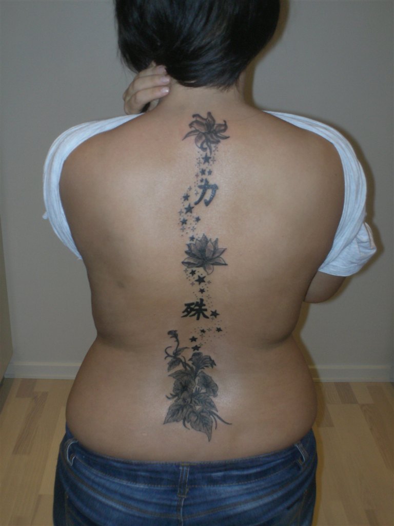 Her er mine. Den på ryggen har jeg selv designet (min tattovør kone har tegnet den (Brugte 4 år på at designe den da alle blomster, kinesiske tegn har stor betydning for mig - blomsterne er en lilje, en lotusblomst og en petuniaplante))
