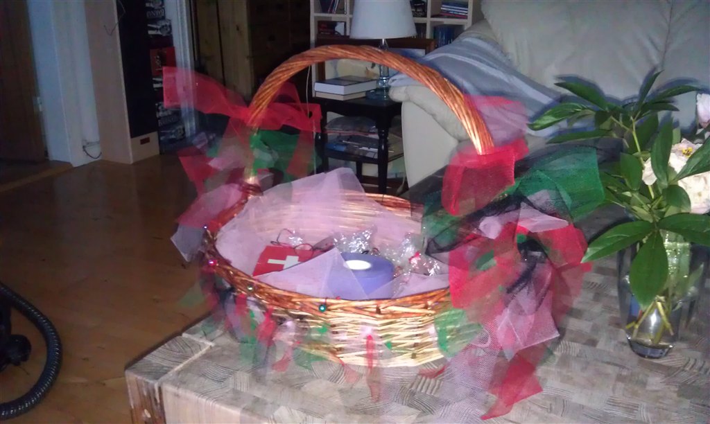 I kurven er der lille toiletpapir, hjemmelavede grønne og lyserøde bolcher, en lille vandpistol og et førastehjælpskit fra sørtrene grene...