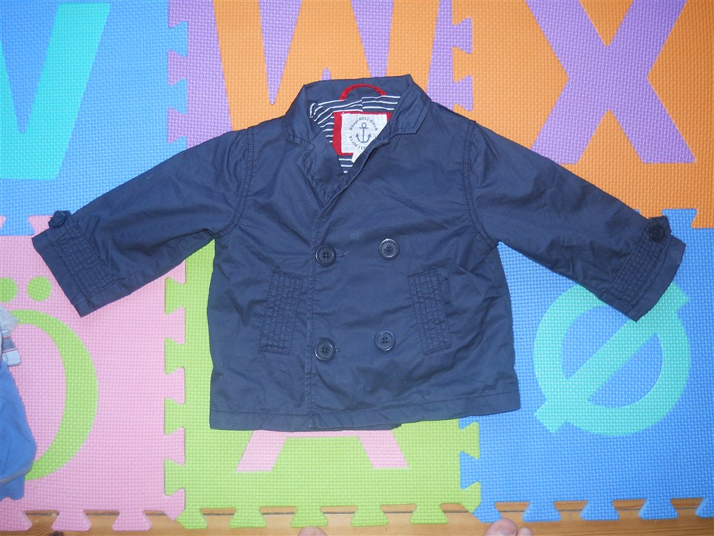 Hvad mærke er den blå jakke? Og er den stor/lille i størrelsen? Og er det bomuld eller "trench-coat" stof? Og til sidst pris inkl. porto?