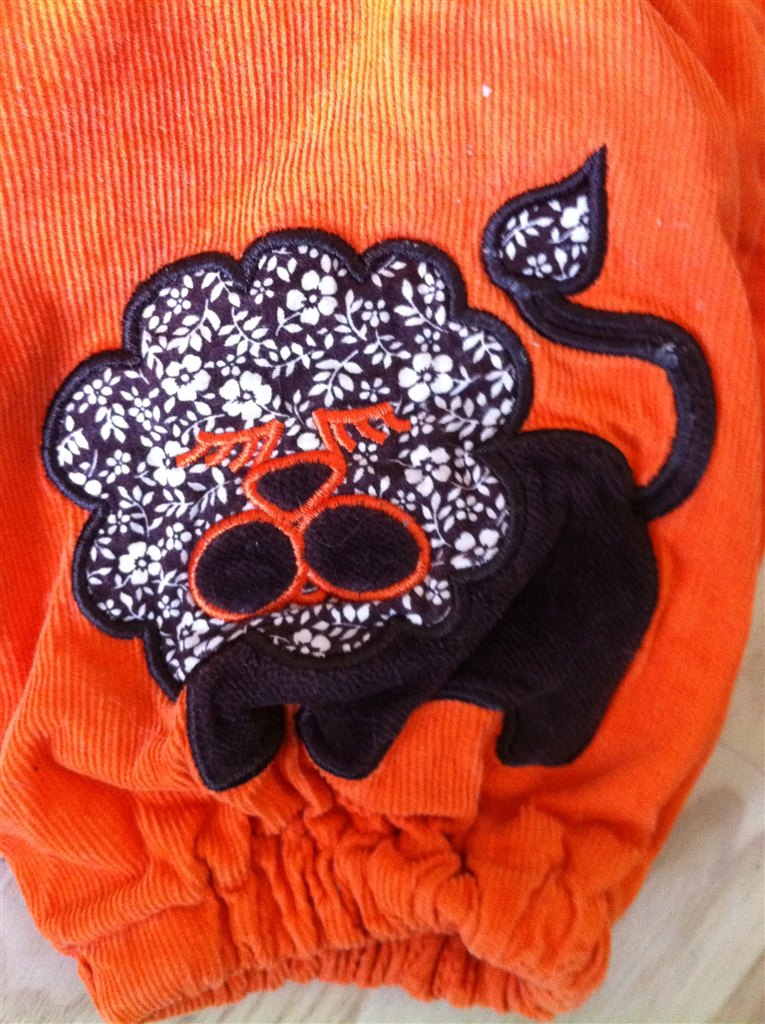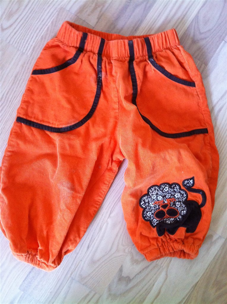 Krutterbukser med påsyet løve i libertystof. Orange babyfløjl, brune detaljer. Str. 6-12 mdr.