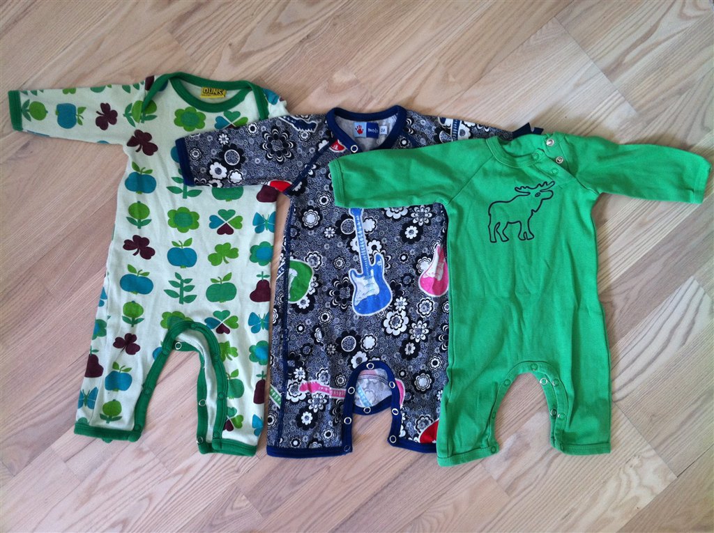 3 lækre heldragter str.56. Molodragten med guitarerne har været brugt 7-8 gange, de andre dragte har været brugt max 3 gange hver. Alt er vasket i neutral og kommer fra et røgfrit hjem.
