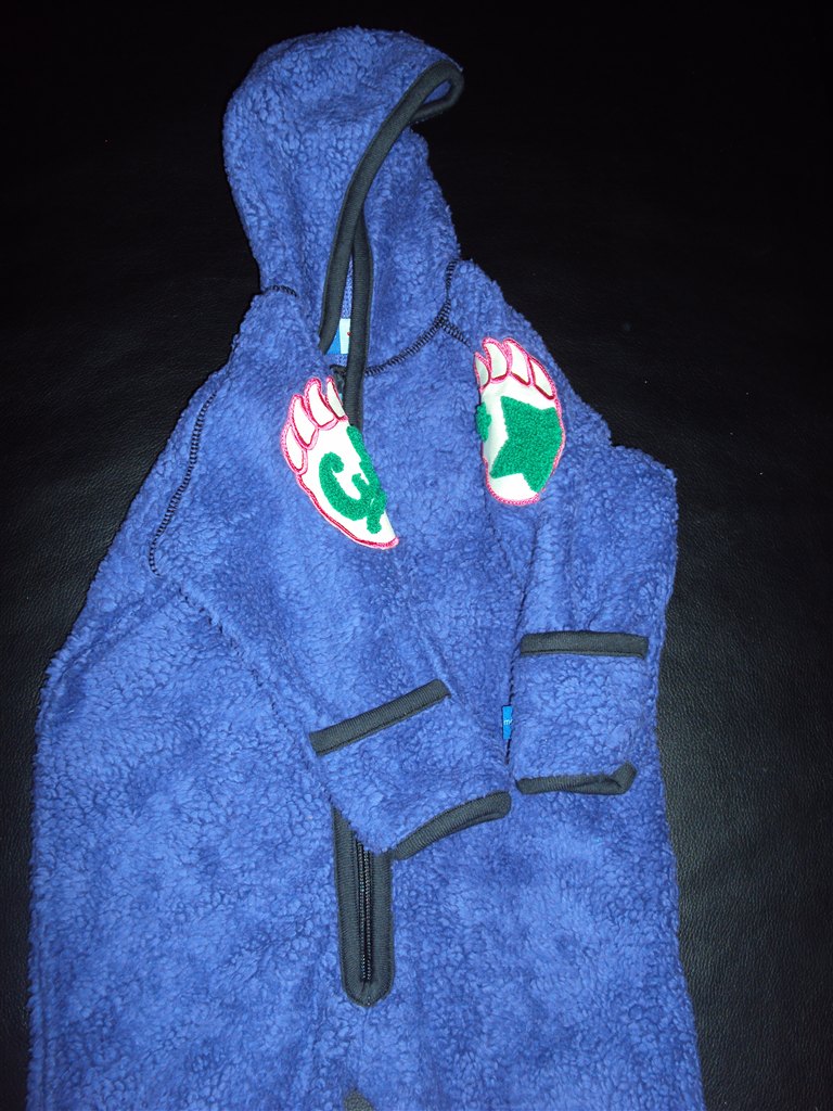 sælger den mørke lilla bjørne klo molo dragt, str 80.