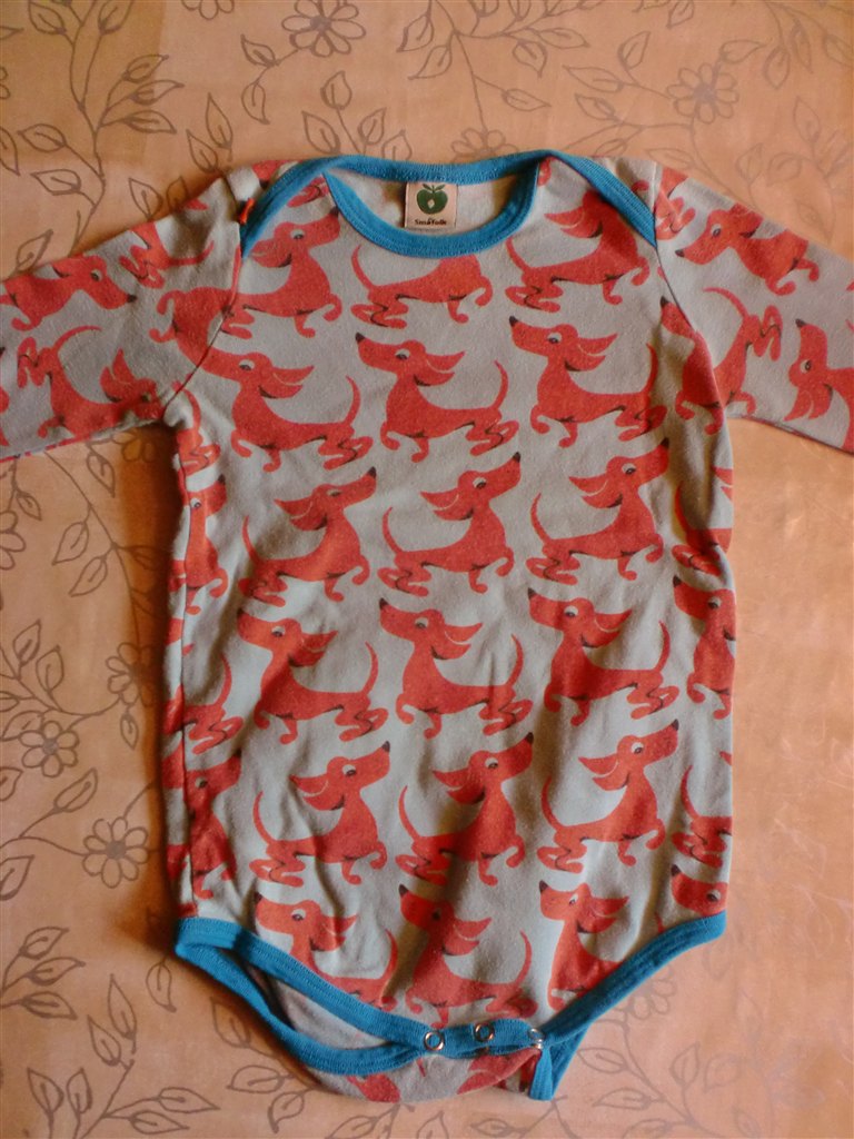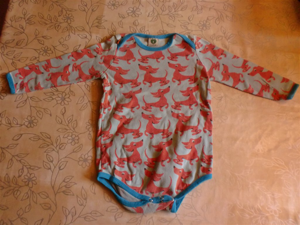 Blå "små-folk"body med gravhunde, størrelse 92 for 45 kr.
