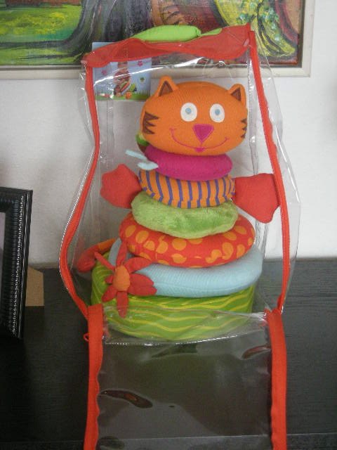 Der står ikke angivet en alder på lege-stable-katten......................men børn skal helst være mellem 1-2 år. før de kan finde ud af at stable.